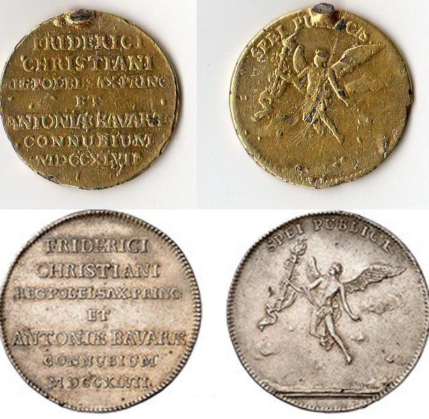Das Motiv gleicht dem 2/3 Taler aus Sachsen von 1747, der anlässlich der Prinzenhochzeit Fridrich Christians geprägt wurde.