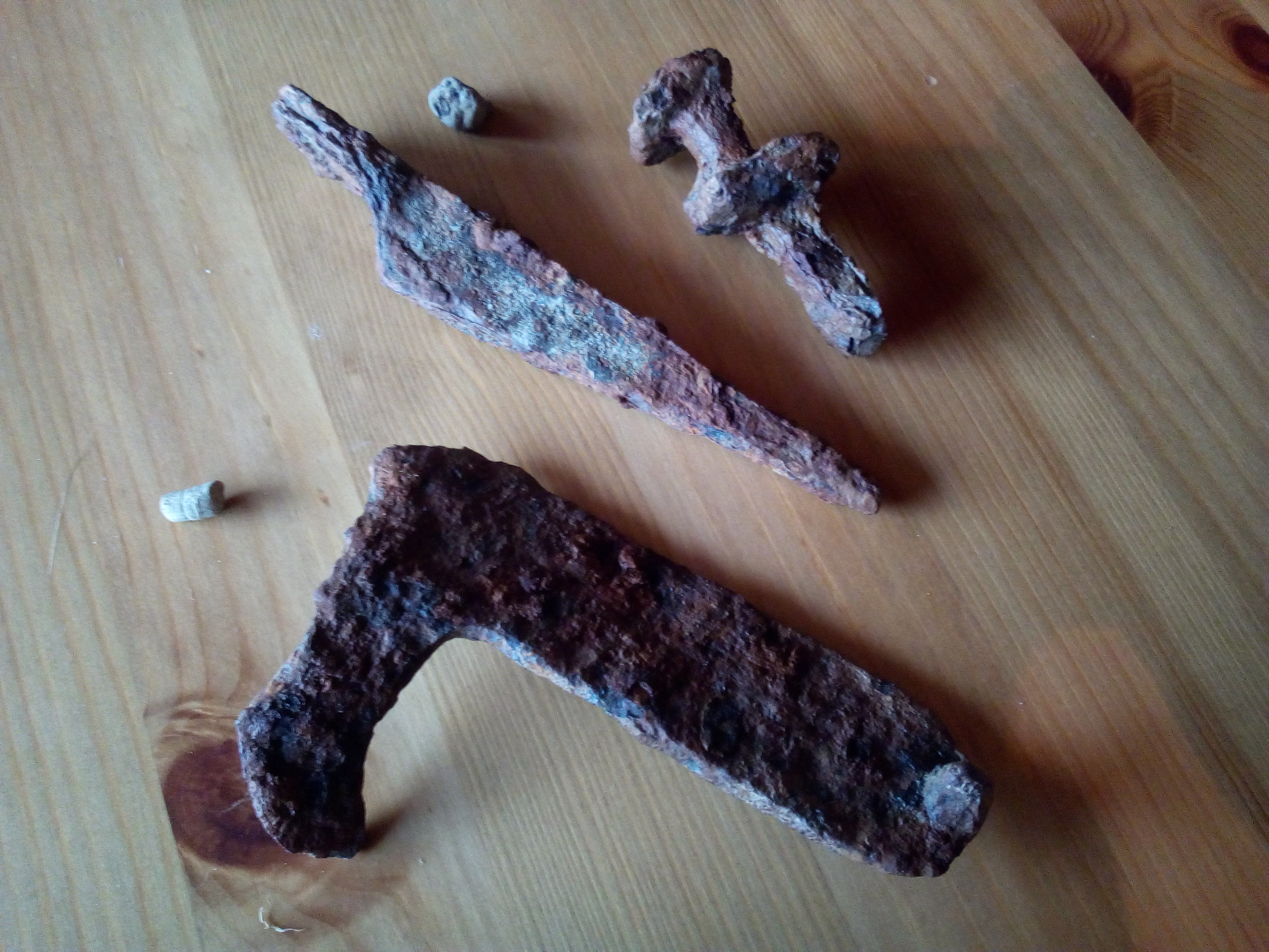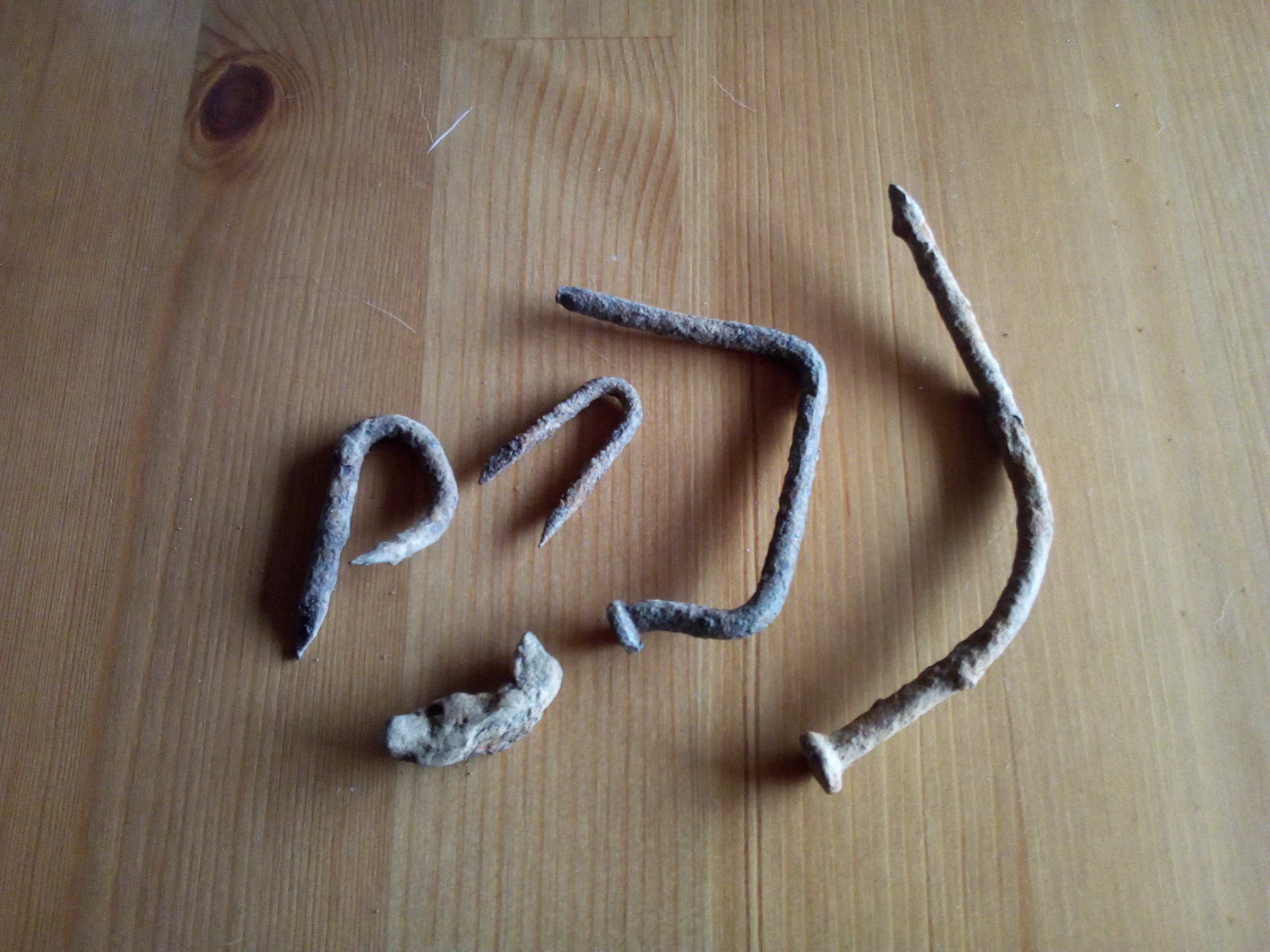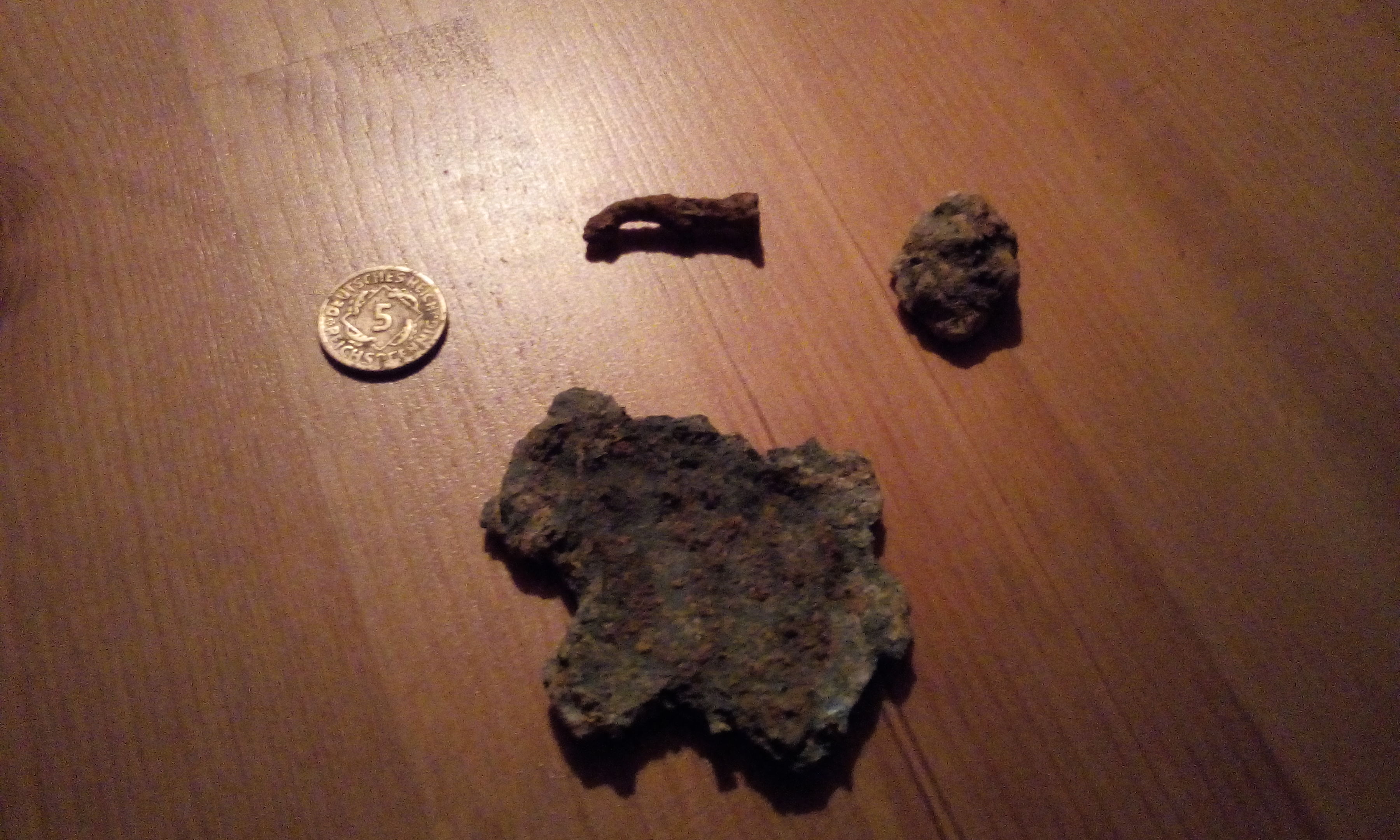 Heute gab es mal wieder eine Hand voll Nägel und die Sachen auf dem Bild. Scheinbar irgendein Schrott von landwirtschaftlichen Geräten. Das eine könnte ein Geschoss sein.