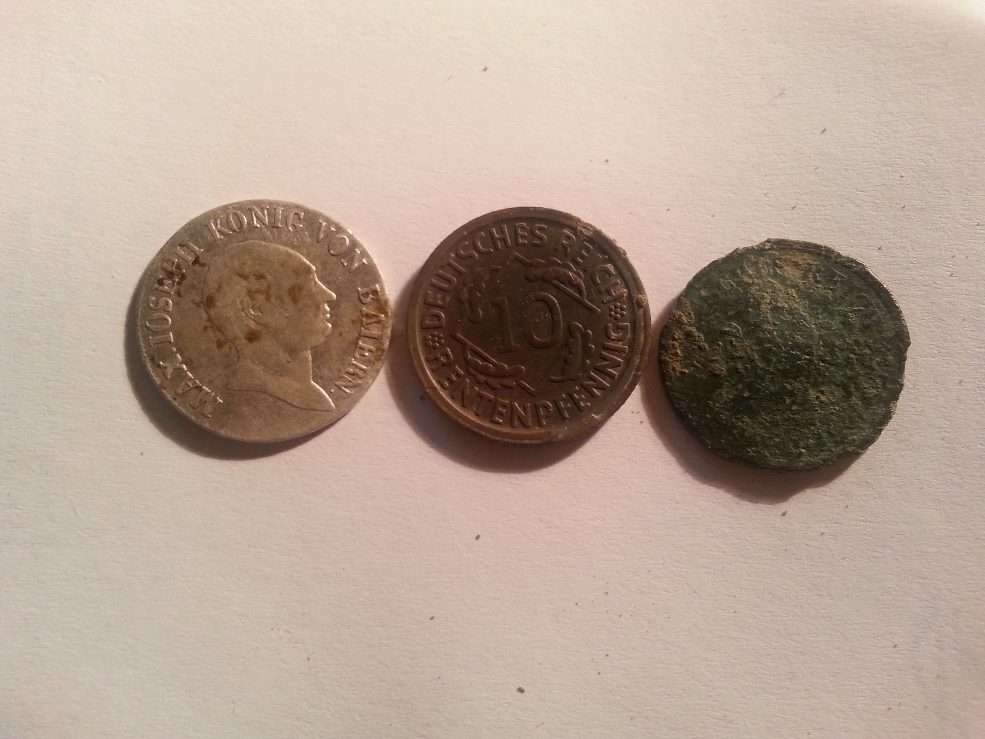6 Kreuzer Max Joseph von Baiern 1807, 10 Rentenpfennig Deutsches Reich 1924 und ein unleserlicher 2 Rentenpfennig