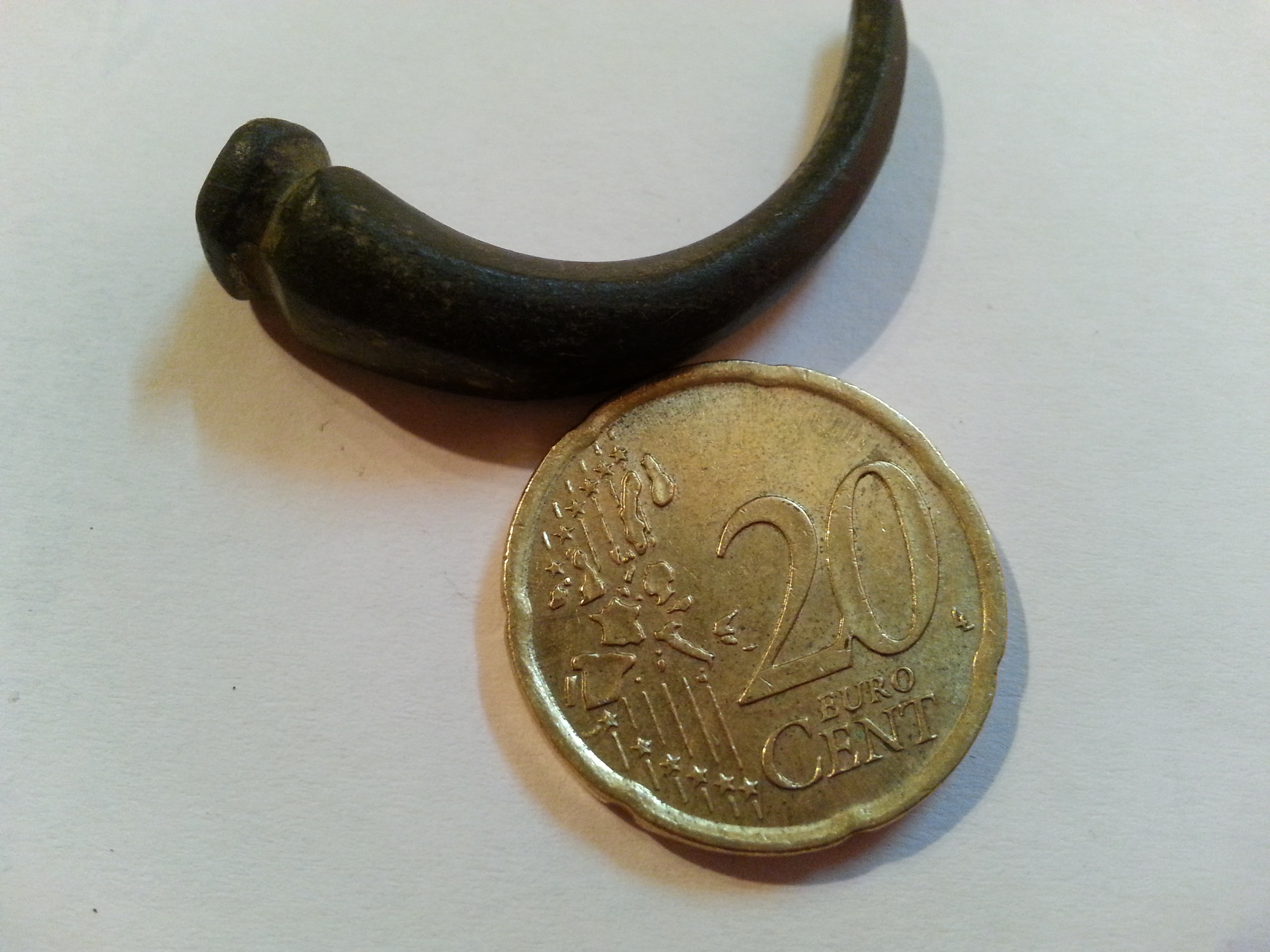 außerdem war das hier noch dabei. Es erinnert von der Form her an eine Kralle. Oben läuft es spitz zu und ist abgerundet. Es ist dort nicht abgebrochen. Auf der anderen Seite war definitiv noch etwas dran. An der Innenseite schimmert es silber/golden. Material ist Bronze.