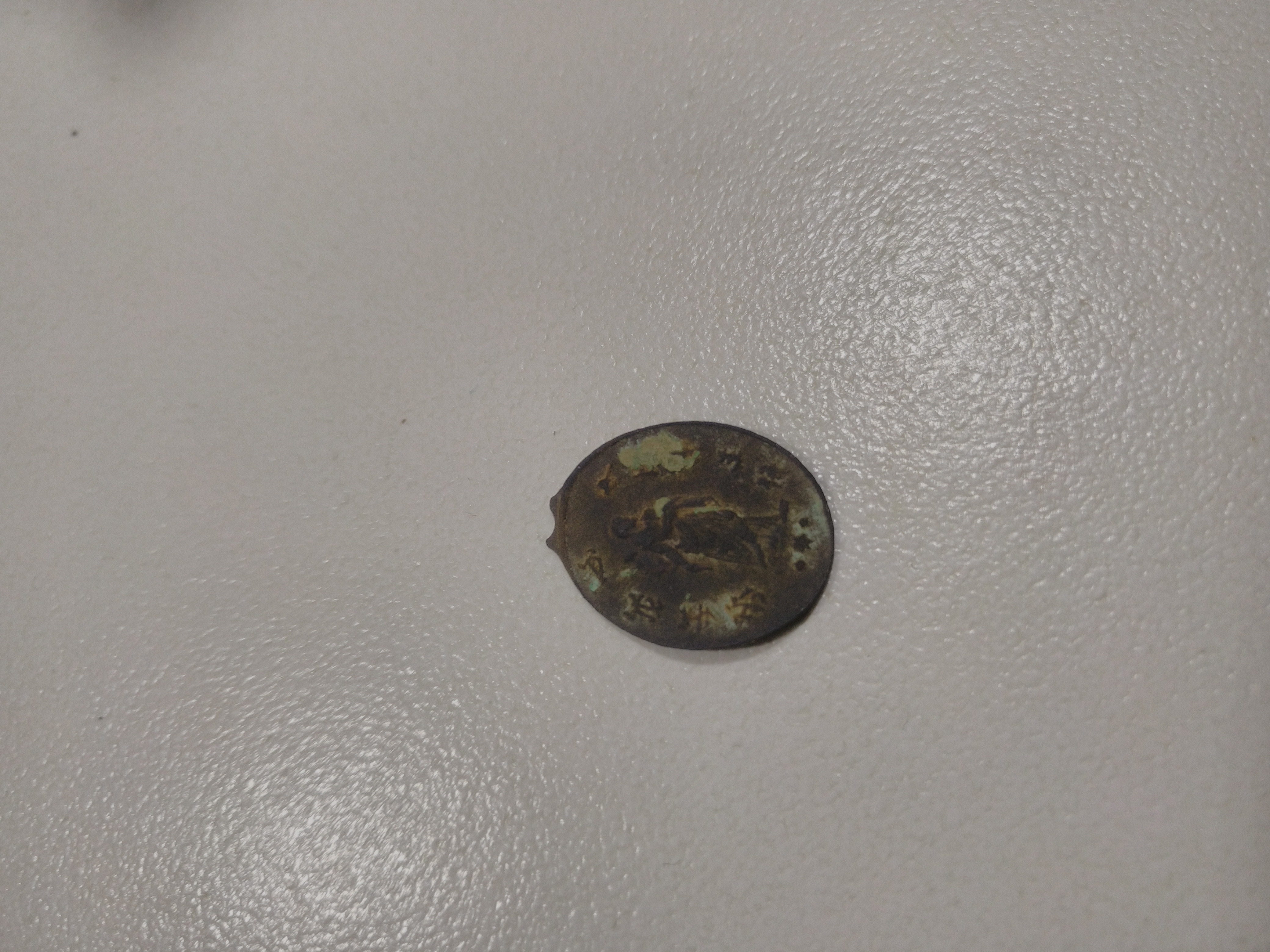 Es ist wohl ein Heiligenanhänger, ziemlich philigran, ein Mann mit Gewand ist abgebildet und vermutlich hebräische Buchstaben.
