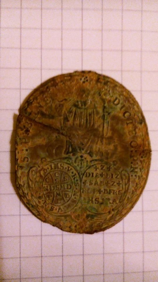 1. ovale Medaille Bronze, heiliger Georg als Drachentöter und vorne Benedict, Pestamulett und Benediktinerkreuz (ca. 1400)