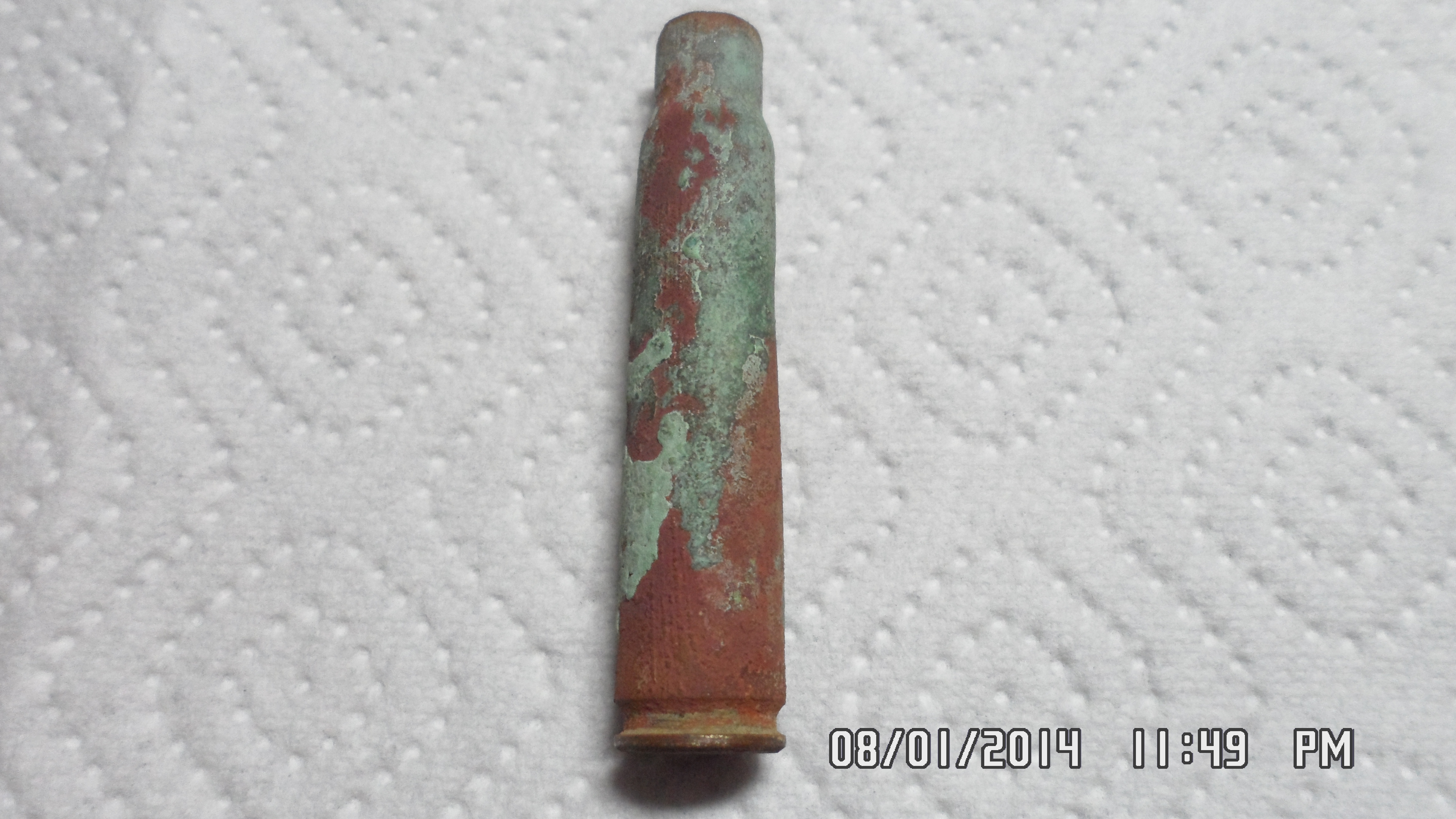 Das besondere an dieser Patronenhülse war, das in der Hülse ein kleiner Zettel steckte. Da die Hülse mit Schmutz verstopft war, habe ich den Zettel beim säubern mit Wasser zerstört.