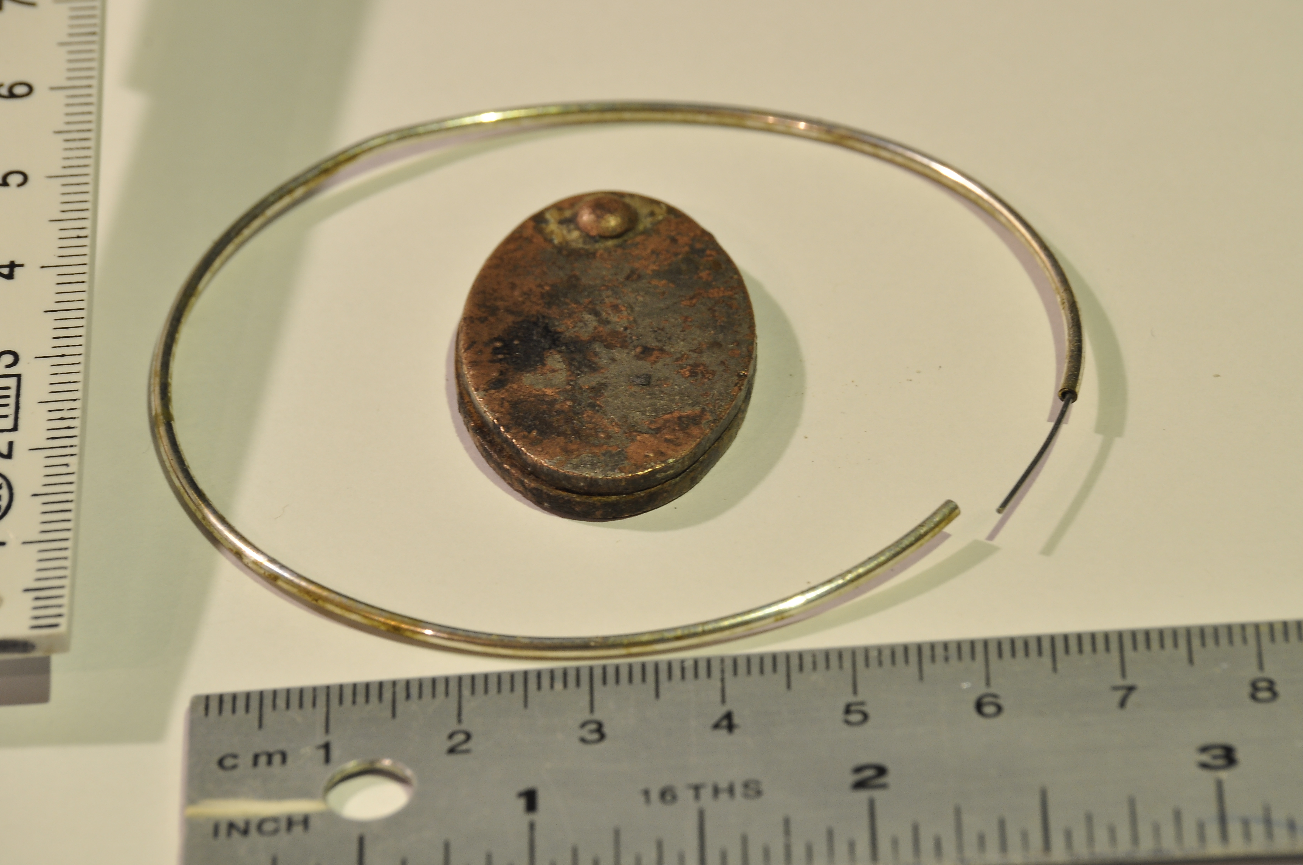 Hier scheint es sich um einen alten Türspion zu Handeln,dessen Ausgangsmaterial Kupfer ist mit einer Legierung.Das andere Stück scheint entweder eine art Ohrring zu sein, oder eine art Armreif.