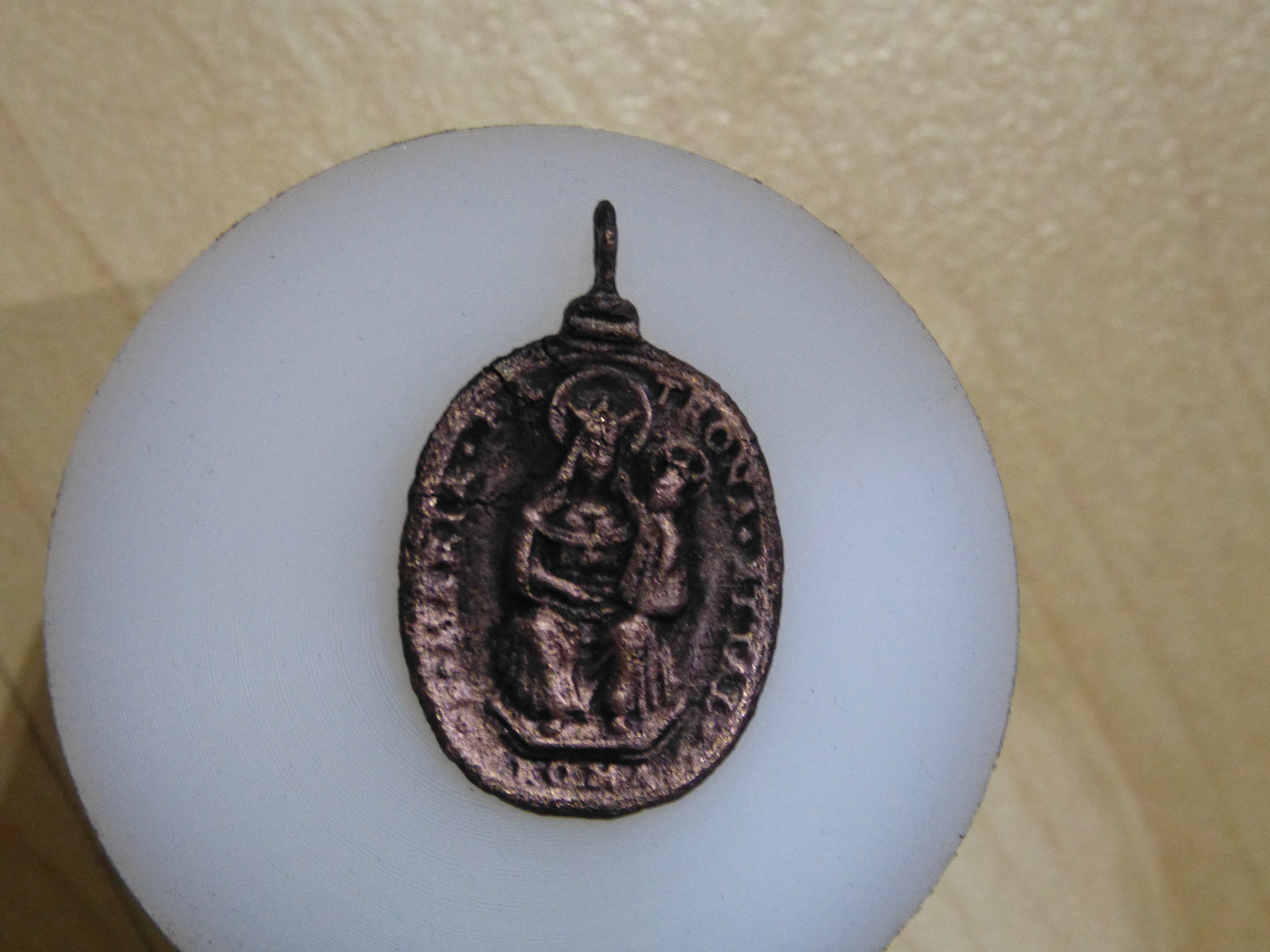 Die Schrift auf dem Anhänger ist leider kaum zu lesen vielleicht habt ihr ja mehr Erfolg. Er hat zwei Seiten mit unterschiedlichen Motiven