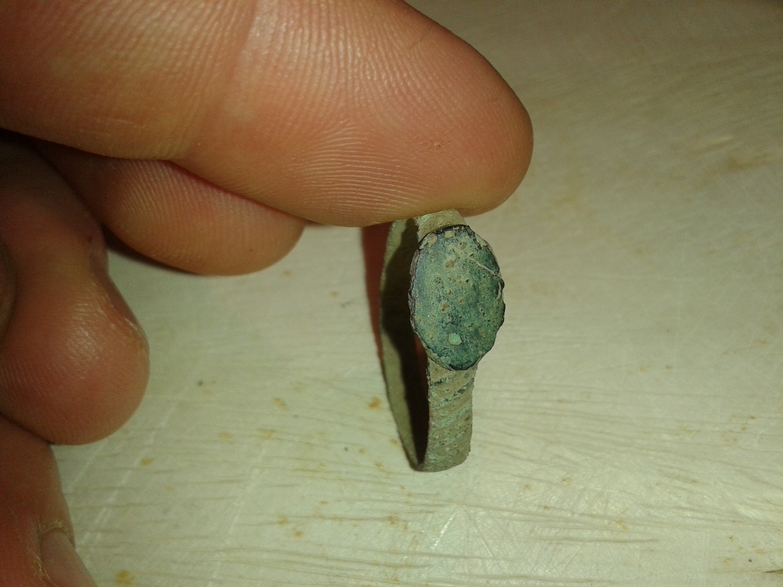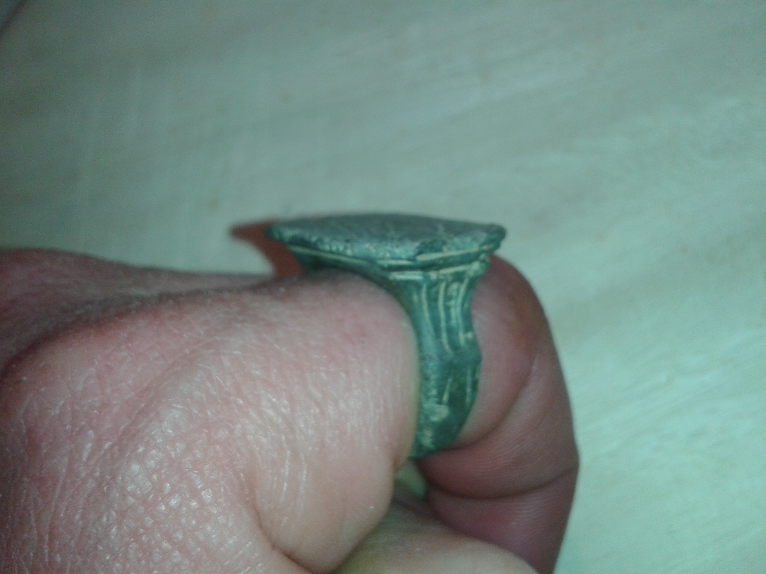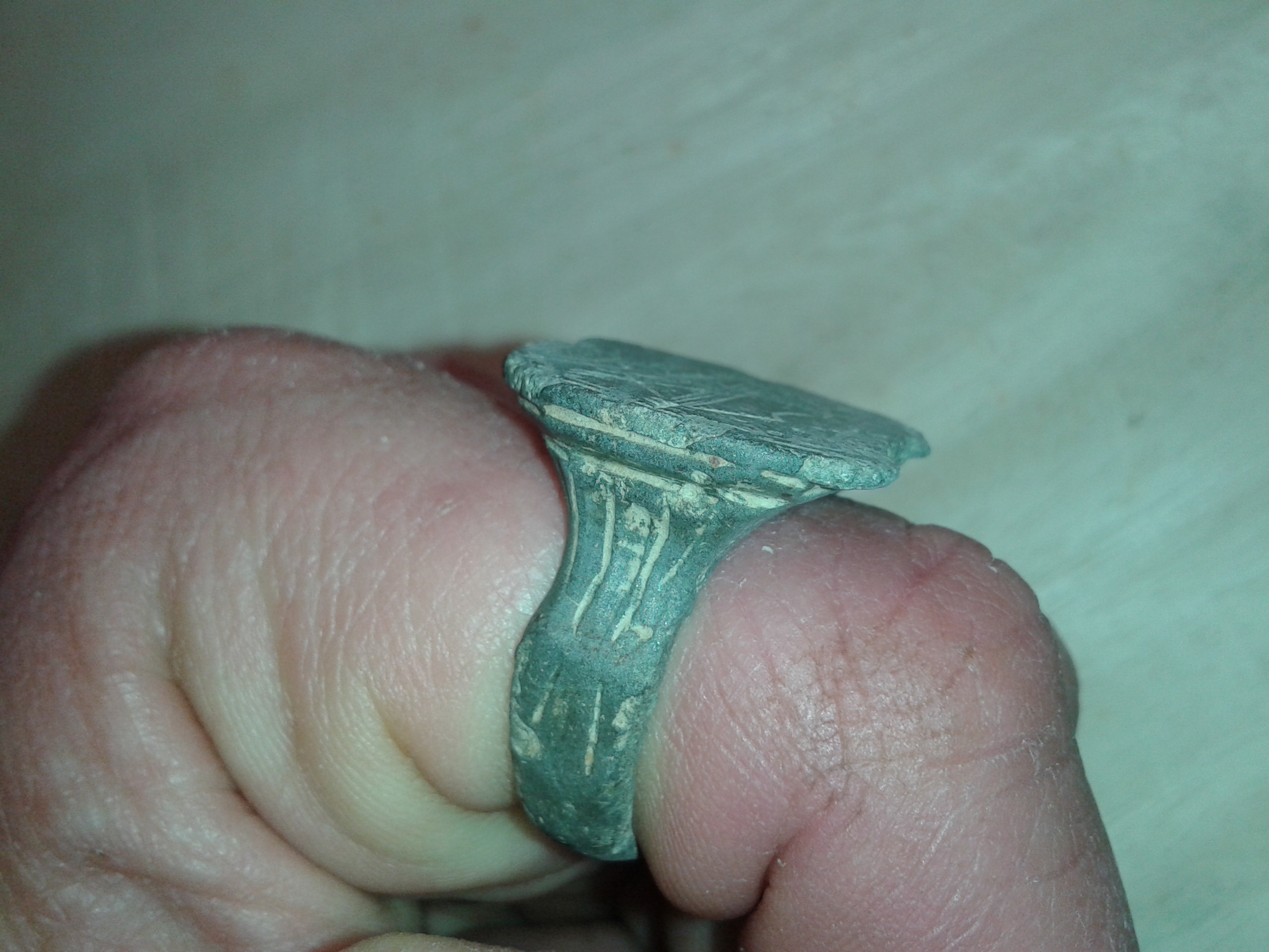 Zuerst dachte ich man sieht auf der Platte ein Wappenschild, aber ich glaube damals wurde dieses Schild als Musikinstrument angesprochen und die Einordnung dieses oder eines sehr ähnlichen Rings ging in die Richtung Spielmannsring und zeitlich in 16./17. JH.