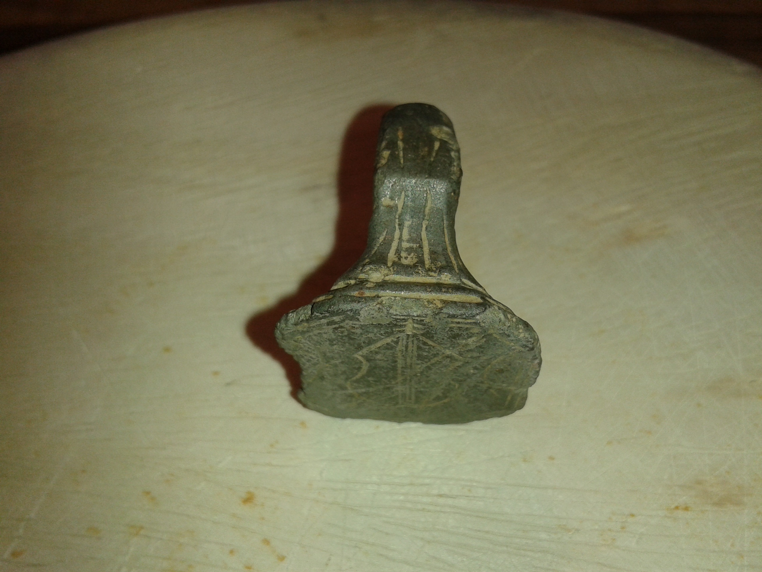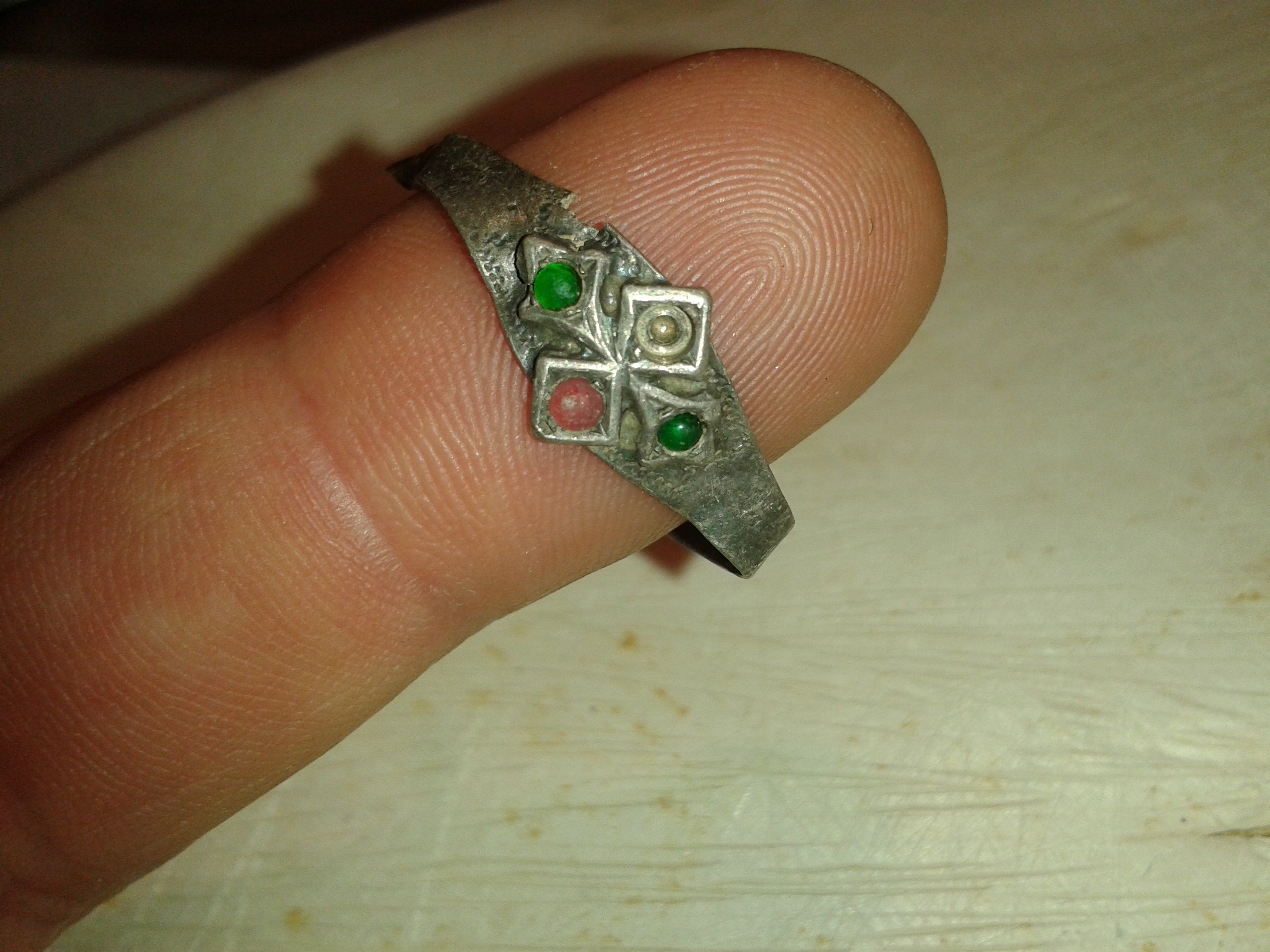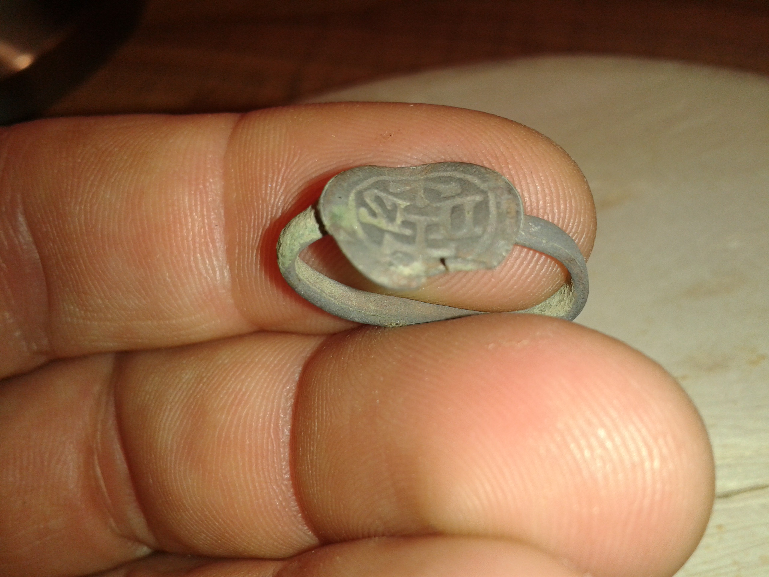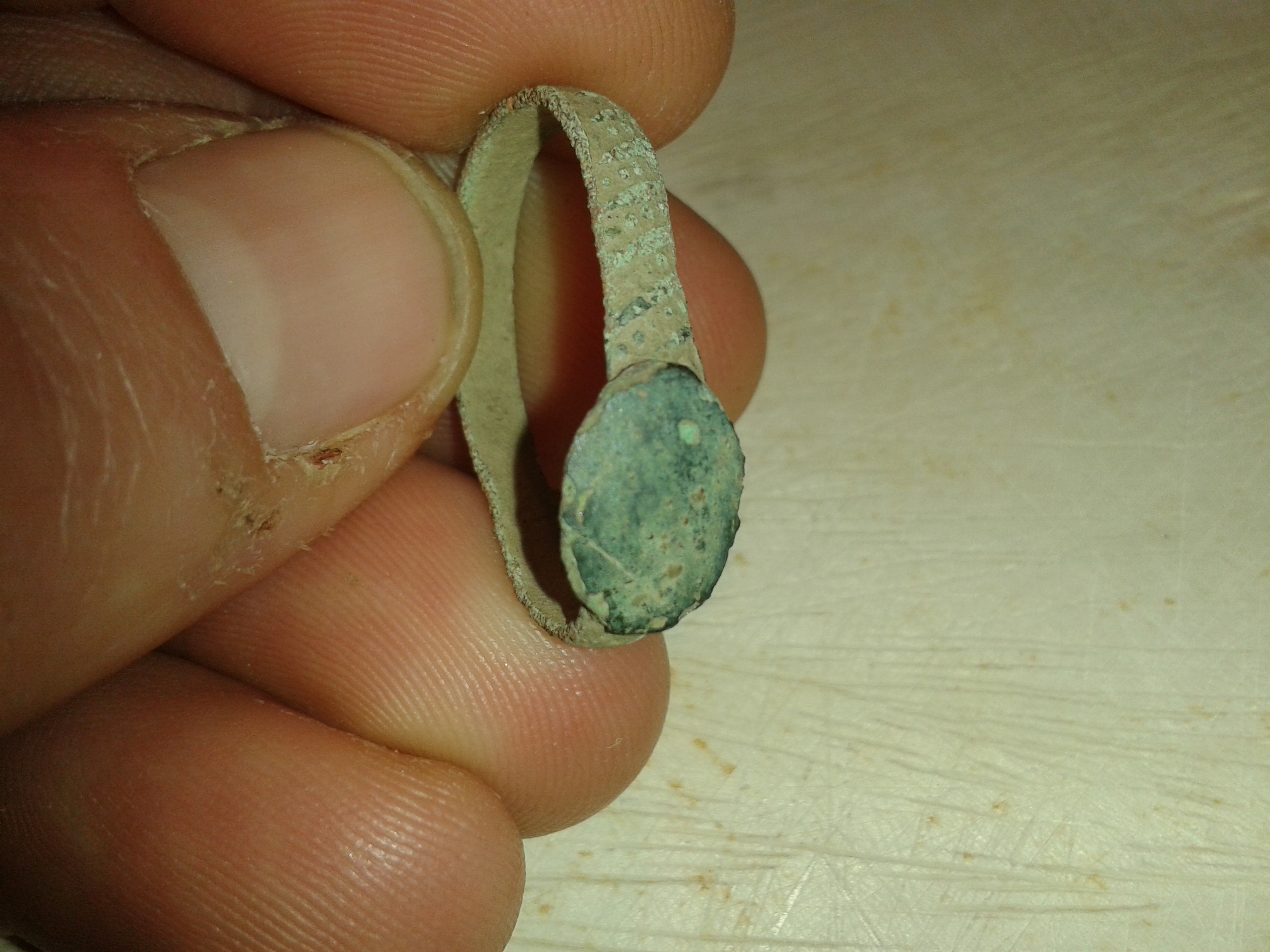 Zuerst dachte ich man sieht auf der Platte ein Wappenschild, aber ich glaube damals wurde dieses Schild als Musikinstrument angesprochen und die Einordnung dieses oder eines sehr ähnlichen Rings ging in die Richtung Spielmannsring und zeitlich in 16./17. JH.