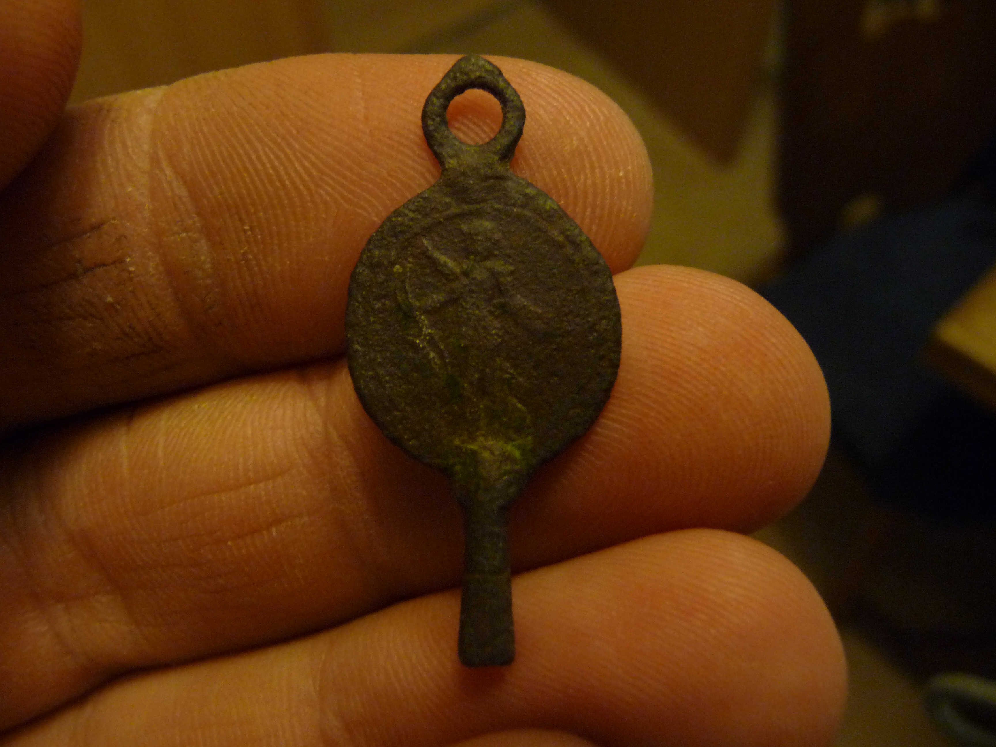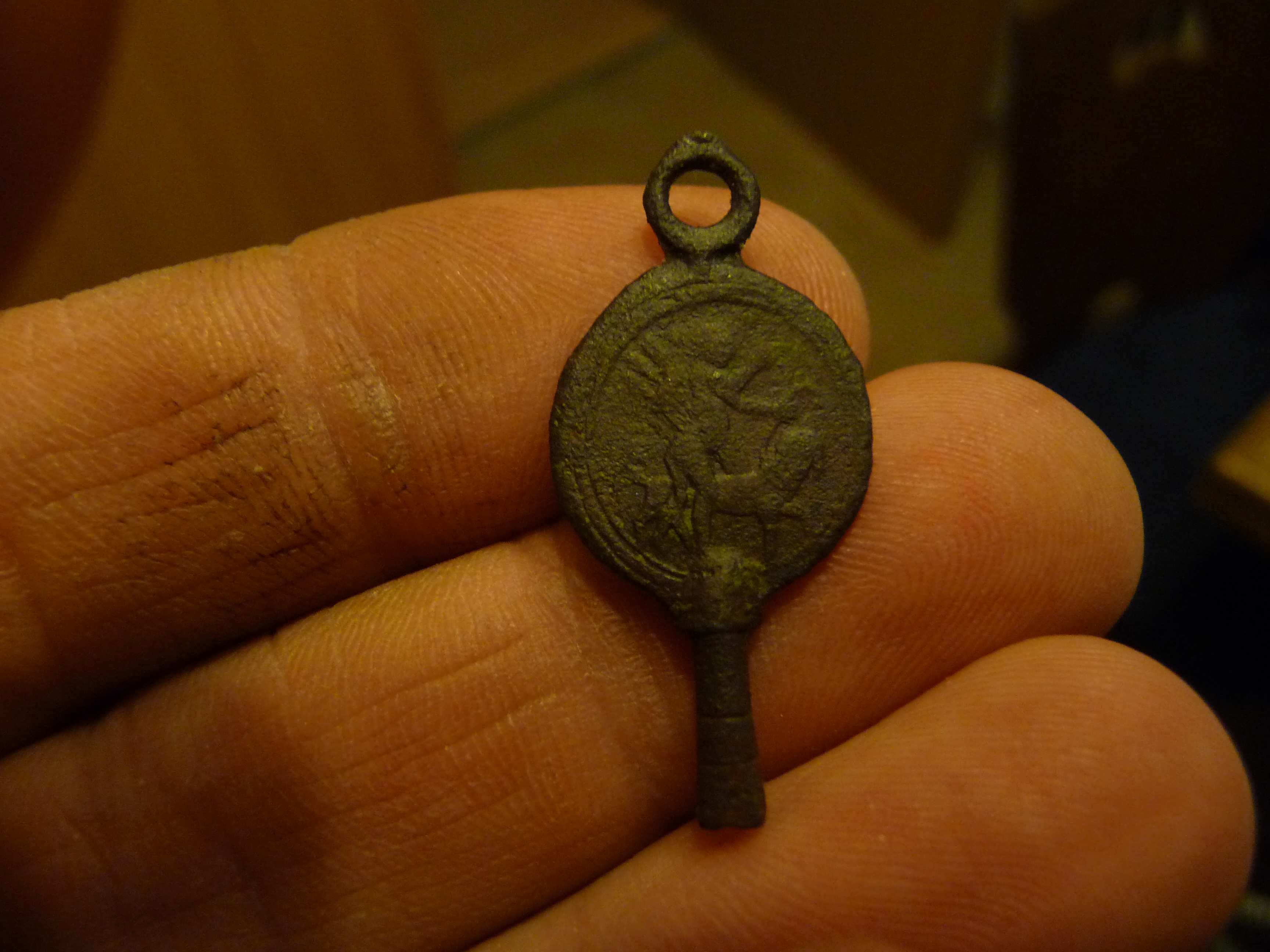 Hab dieses Teil gefunden. Als erstes hab ich gedacht es wär ein Schlüssel von einer alten Spieluhr bzw Taschenuhr. Nachdem ich es sauber gemacht habe kamen 2 Motive zum vorschein. Einmal ein Mensch wie es aussieht mit Pfeilen am Rücken und Dolch in der Hand mit einem Tier darunter. Auf der anderen Seite ein Jäger/Soldat mit einem Bogen.