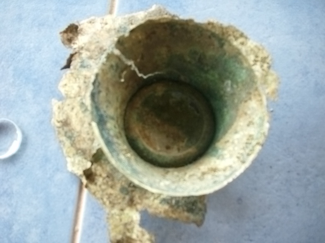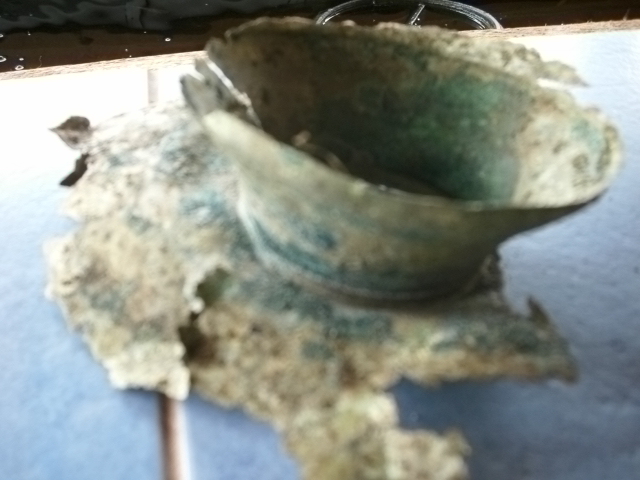 sieht aus wie das Fragment eines Bronzegefäßes ( Fußschale, Kelch, Pokal ). Ob es aus Bronze oder Kupfer ist kann man anhand der Bilder nicht feststellen, ob es handgefertigt oder maschinell hergestellt wurde auch nicht.
