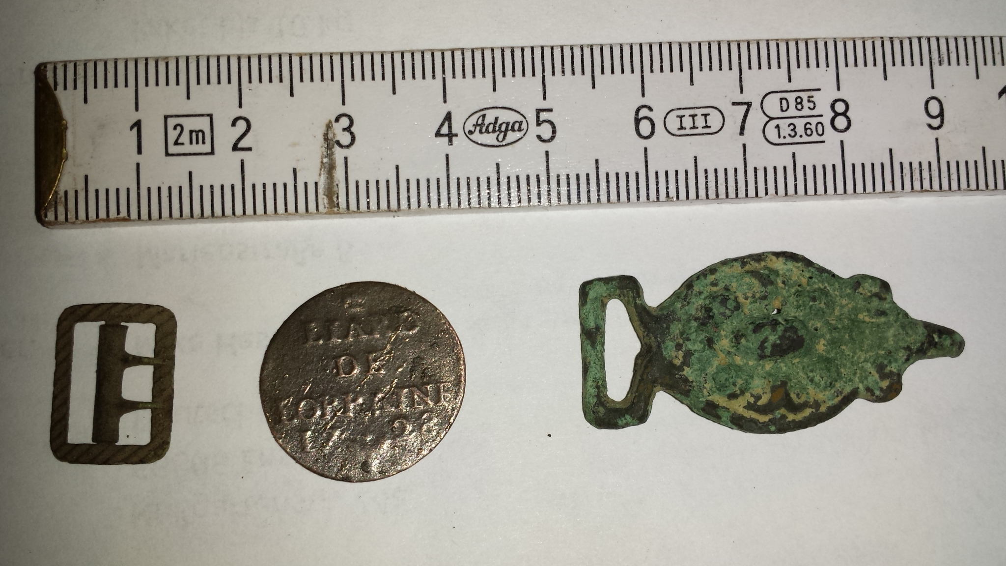 Links eine kleine Schnalle von einer Uhr, in der Mitte eine frz. Münze "Liard De Lorraine" von 1728 und rechts ein Ufo, bei dem mir jemand helfen muß. Material vermutlich Bronze. Der kleine Zapfen ist nach innen gebogen.