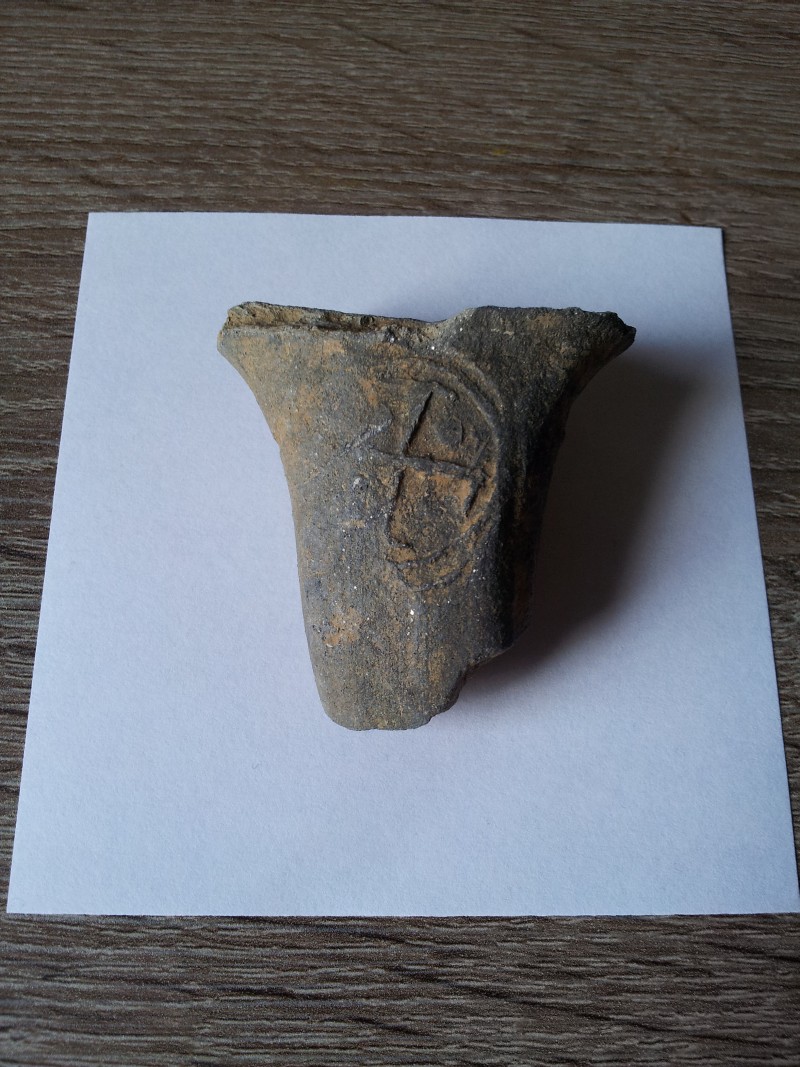 Ich glaube, das Teil ist ein Stück vom Henkel eines Tongefäßes. Das wird deutlich an der großen Bruchstelle und an "streifigen" Oberfläche. Das Kreuzsymbol muss mit einem Stempel aufgebracht sein, der nicht über die ganze Oberfläche abgerollt wurde.