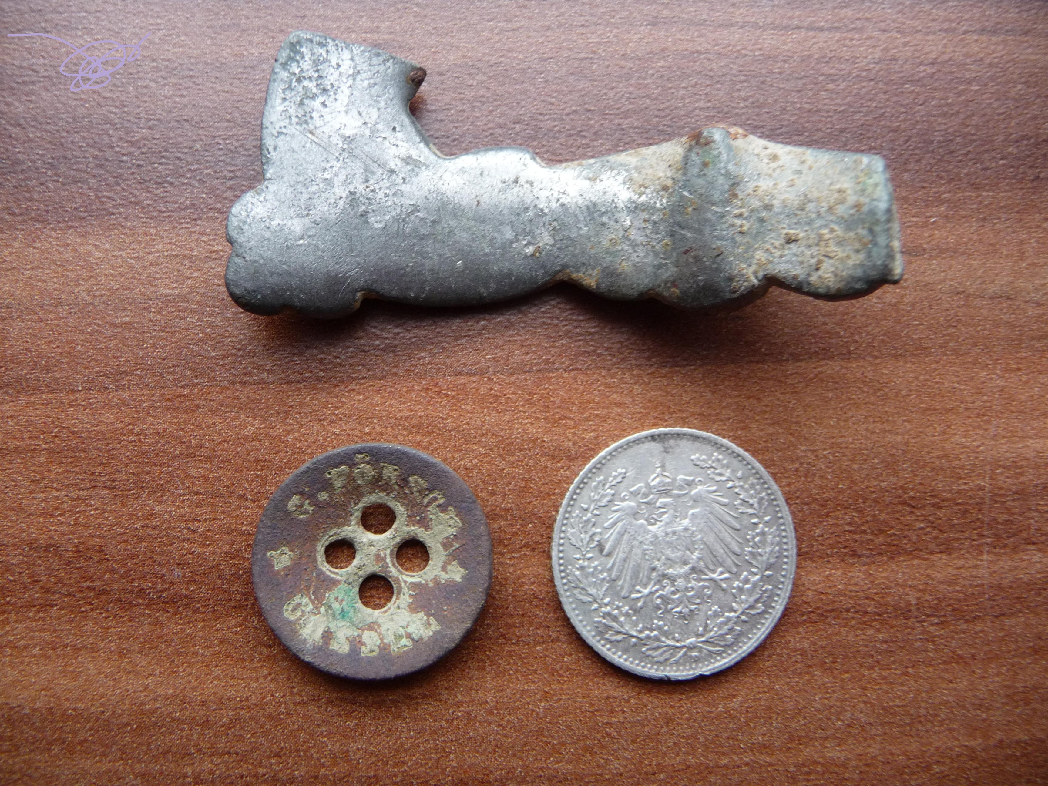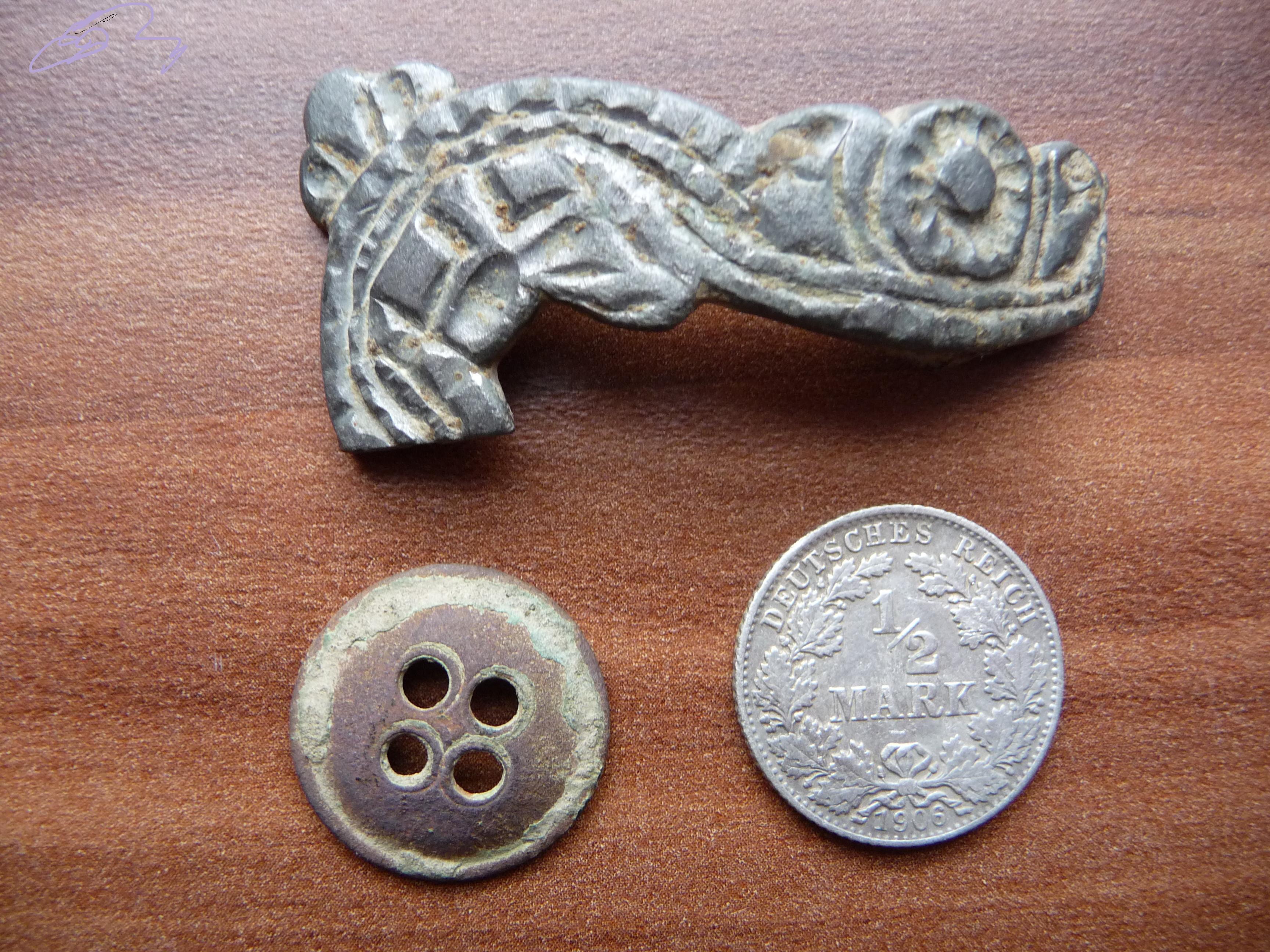 War Sonntag mal 2 Stunden unterwegs. Ne schöne 1/2 Mark ist rausgekommen nen Knopf könnte vom Militärhersteller sein glaub ich. Und nen Ufo. Es ist verziert leider auch abgebrochen. Kann das von einer Tracht oder Pferdegeschirr sein ?