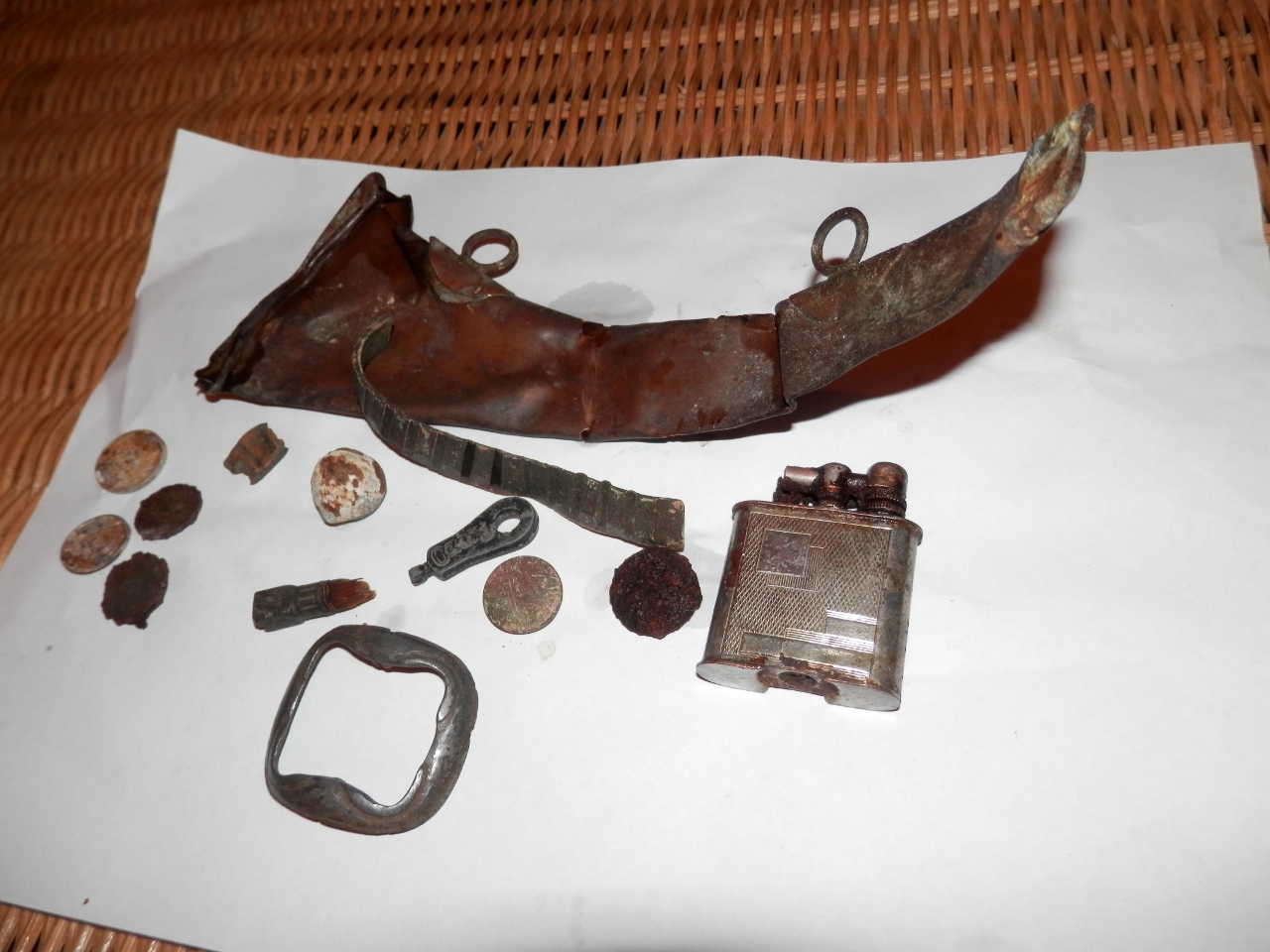 Hallo Leute :winken: Nur wenige hier im Forum :D kennen das Lied vom Kleinen Trompeter :ironie Es war Wahr :) Und ich habe heute seine Trompete gefunden :cry: Naja wir hatten Fun . Das Zugband ist mein Längstest was ich bis jetzt gefunden habe, und das Feuerzeug ist kein Zippo aber ganz Nett und eine Musketen Kugel :thumbup Die Münzen sind nix besonderes :)