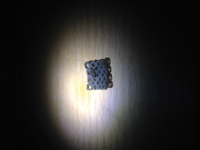 Er ist Quatratisch 1,2 x 1,2 cm ,leicht gebogen mit Löscher und in einigen scheinen steine zu sein denke mal ( Glas ) der knofp könnte aus Kupfer sein
