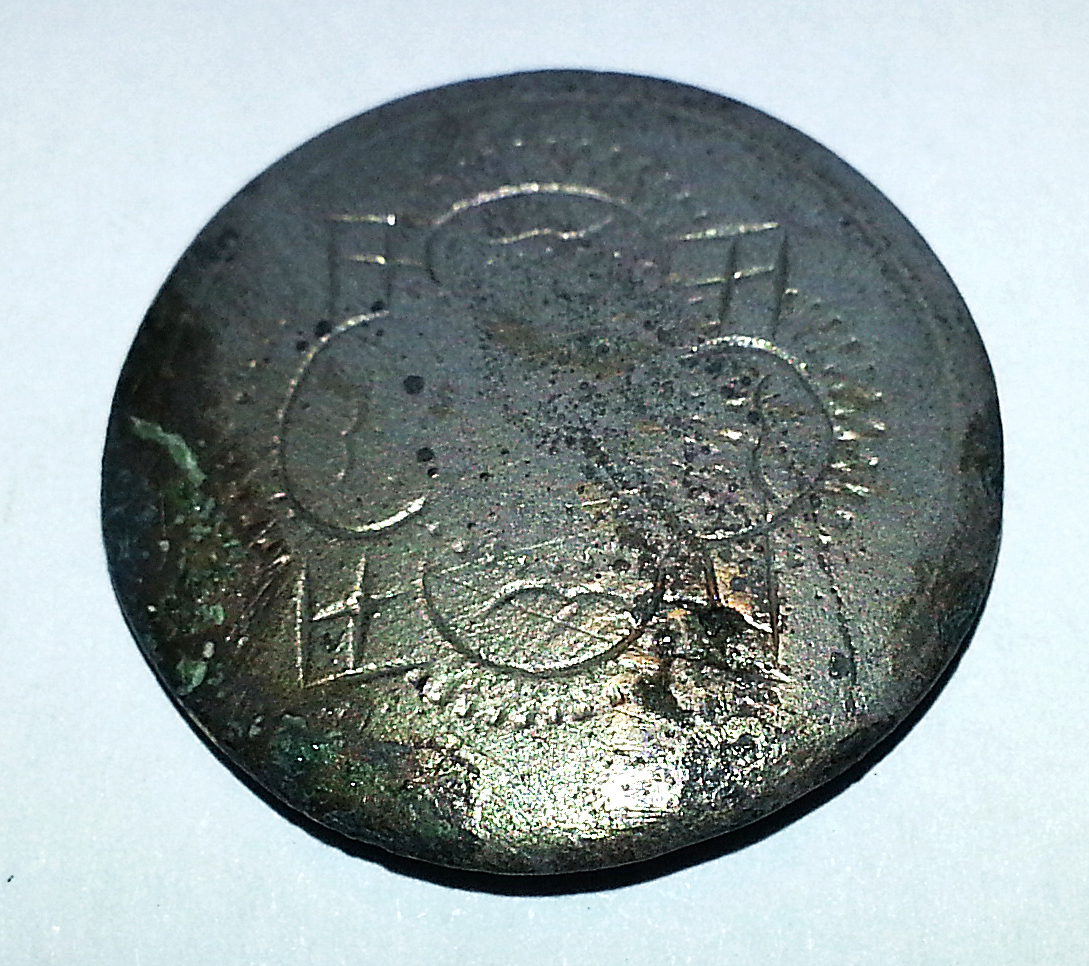 Scheibenknopf des 18 Jhdt aus sogenannter "Arsenbronze" .......irgend Weißkupferlegierung mit kaum - ganz ohne Arsen drin