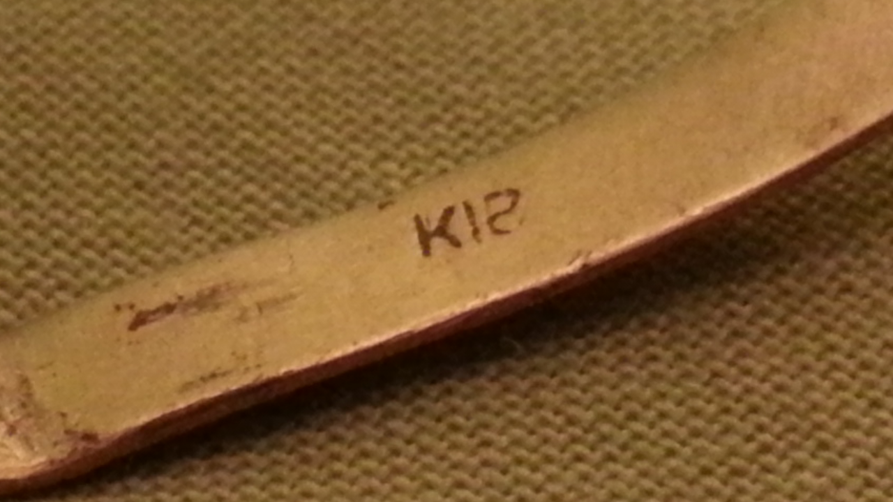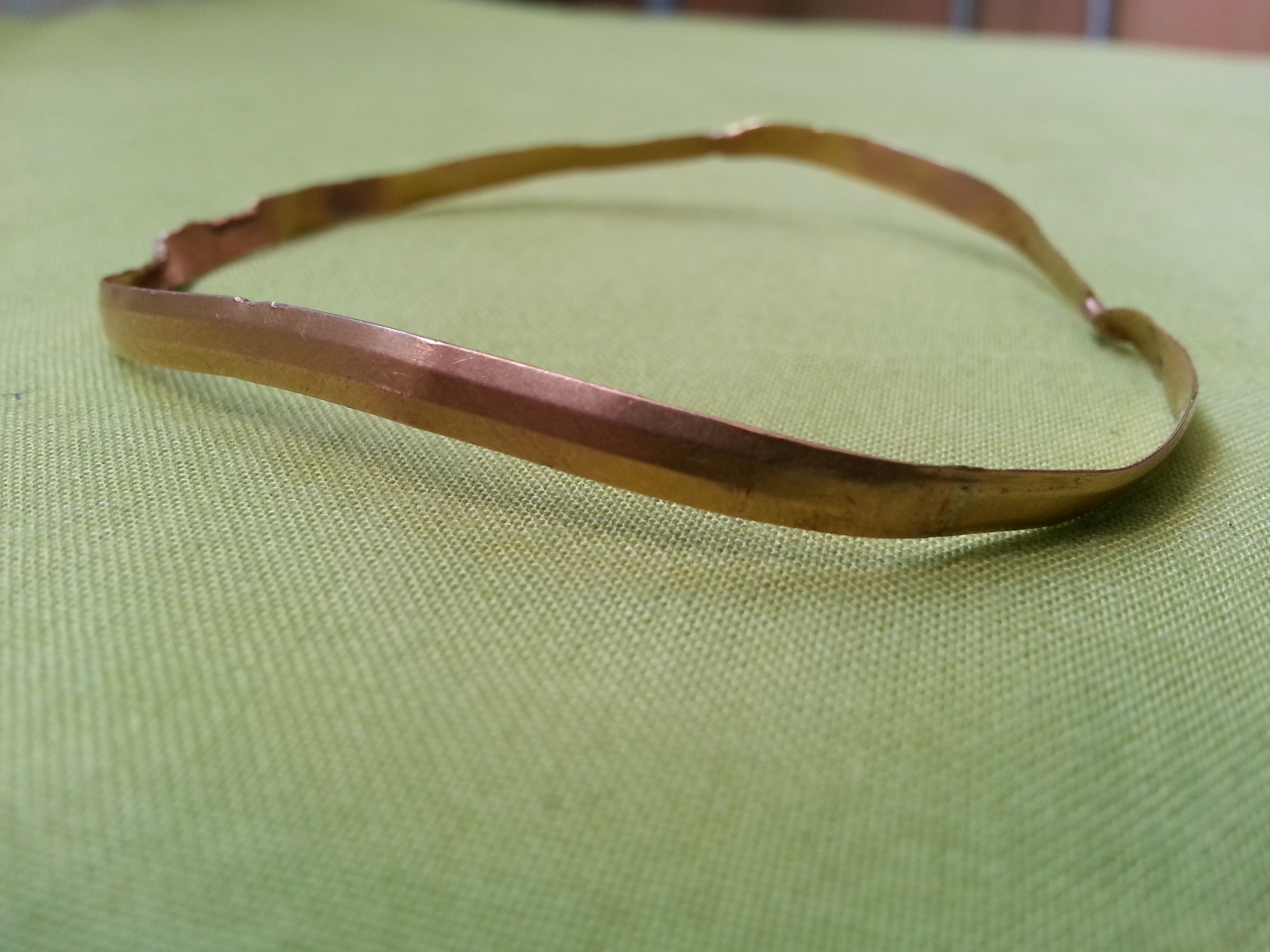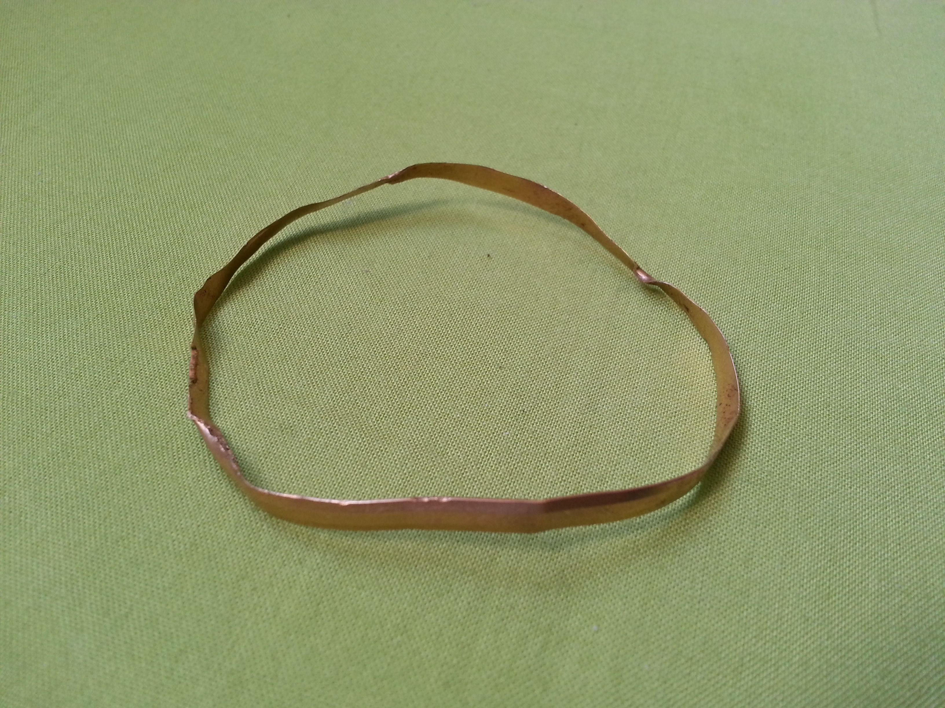 habe gestern im Wald neben einer alten Kopfsteinpflasterstraße zwischen zwei Dörfern einen dünnwandigen Ring mit etwa 65mm Durchmesser gefunden. Das Gewicht beträgt 5,6g und in der inneren Fläche ist eine kleine Prägung (siehe Foto). Kann es sich hierbei vllt um einen kleinen Armreif oder so aus Gold handeln?