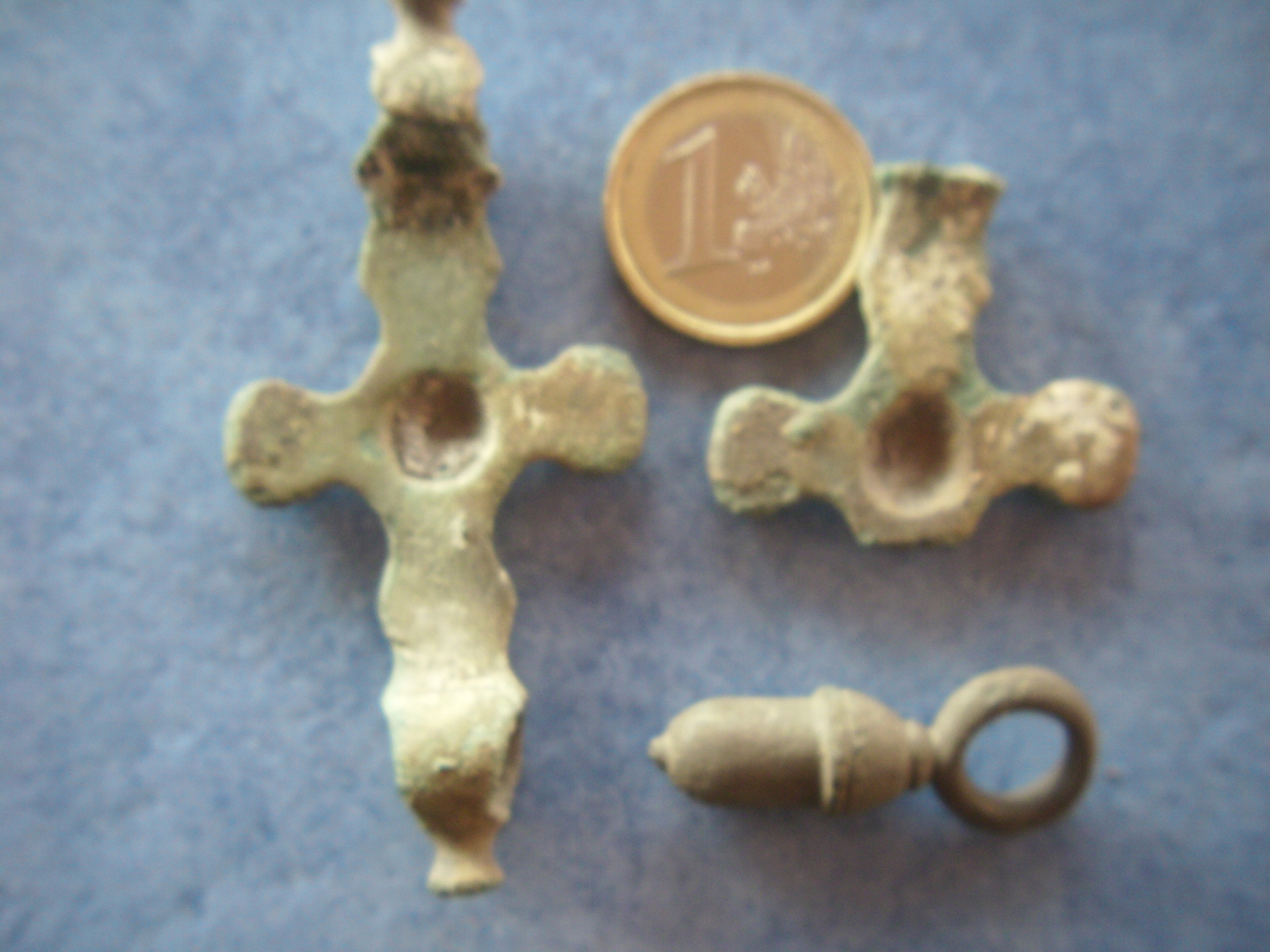 3 unbekannte Teile, die obere Spitze von dem großen Teil, habe ich schon vor 5 Jahren gefunden, der Eichel Anhänger könnte von einer römischen Waage stammen, wäre für Hilfe sehr dankbar.