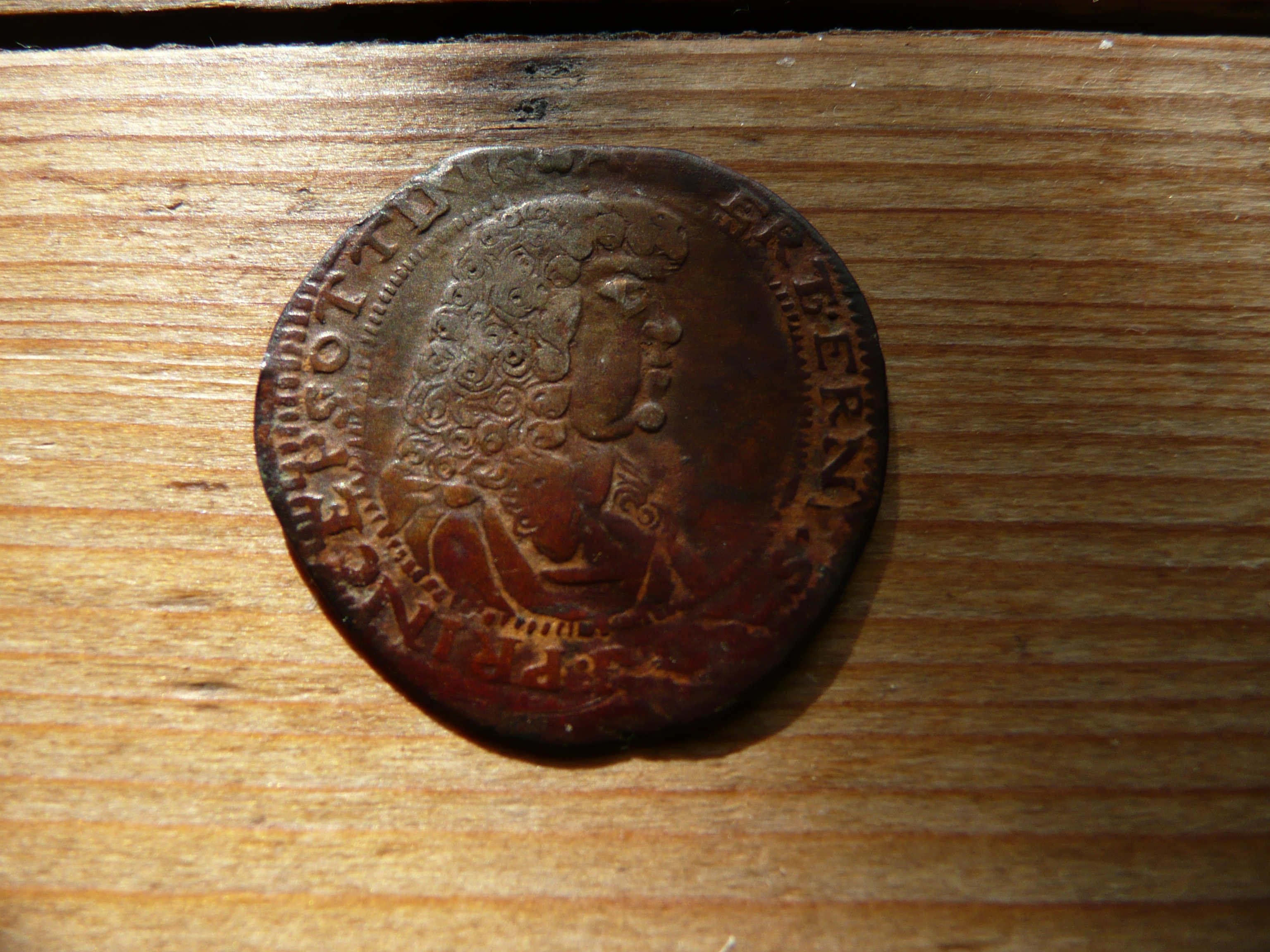 Ich musste spontan erstmal an Friedrich Wilhelm I. denken, als ich den gesehen habe. Finde da ist ziemlich viel Ähnlichkeit, selbst das Symbol auf der Brust scheint dem auf dieser Münze hier zu ähneln, könnten aber auch Haare sein auf deiner Münze.