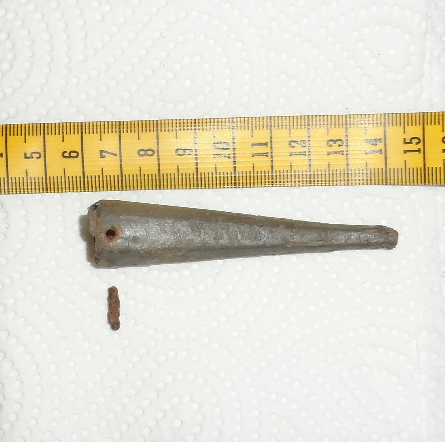 Wir haben eine unbekannte Spitze gefunden sie ist innen hohl und hat ein kleines Loch in diesem Loch war ein Befestigungsbolzen.