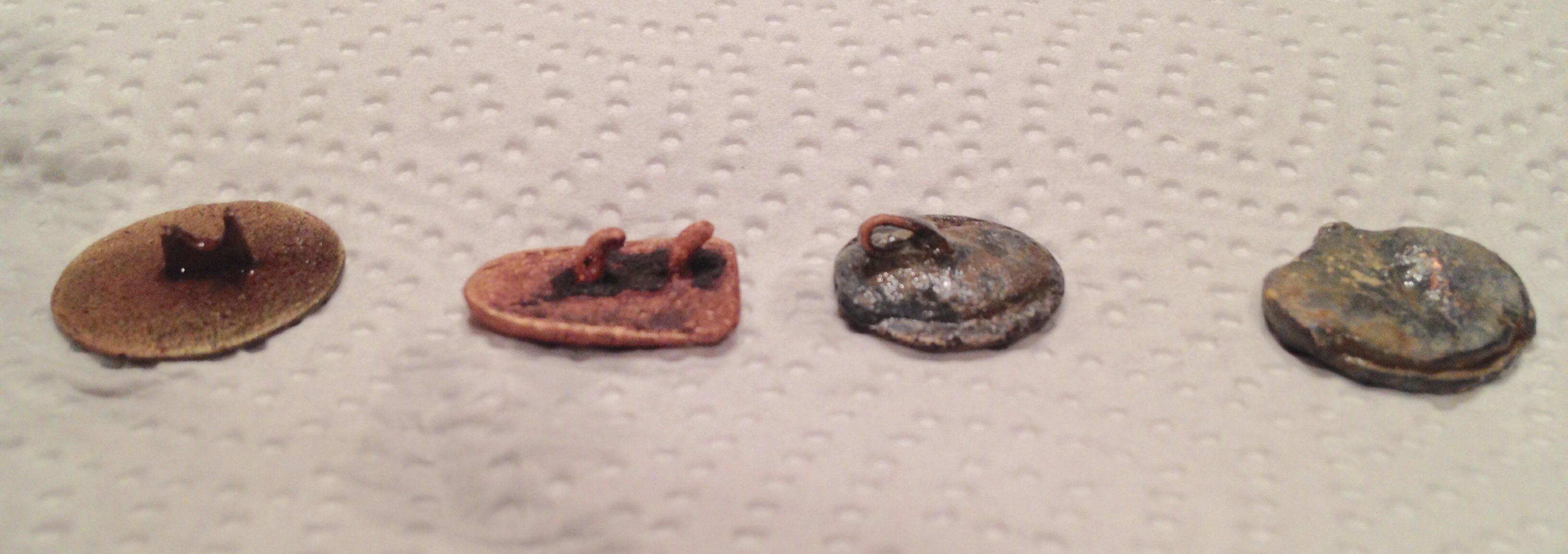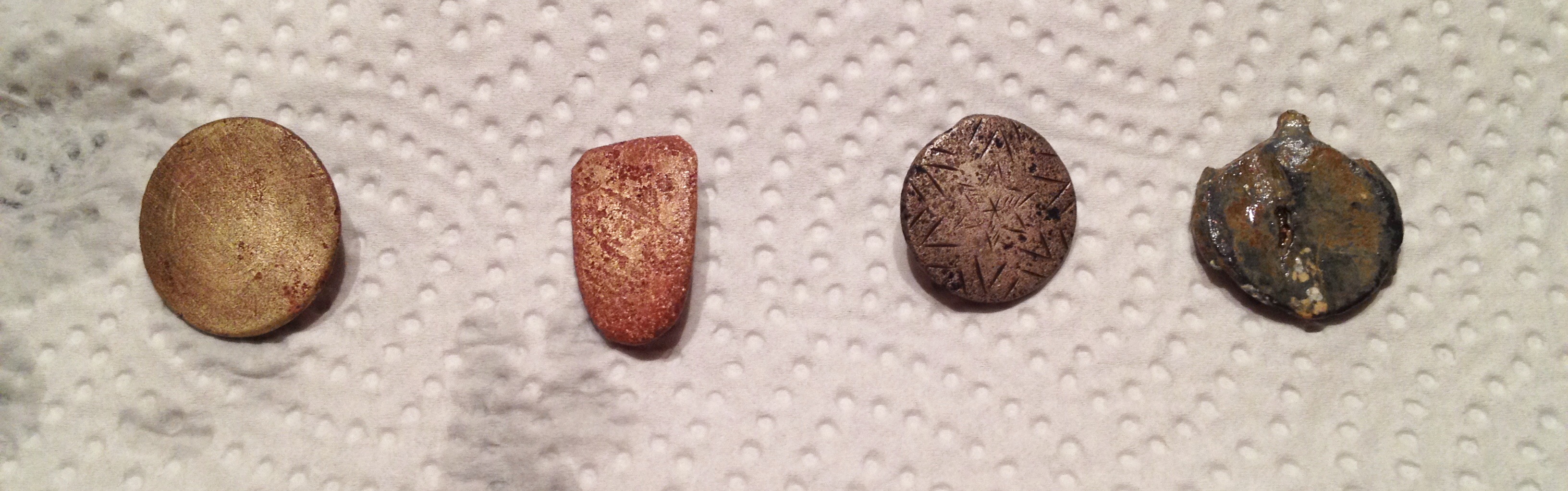 Nun hab ich auch mal was gefunden. Knöpfe und eine Plombe? Leider, bis auf einen, alle ziemlich blank.