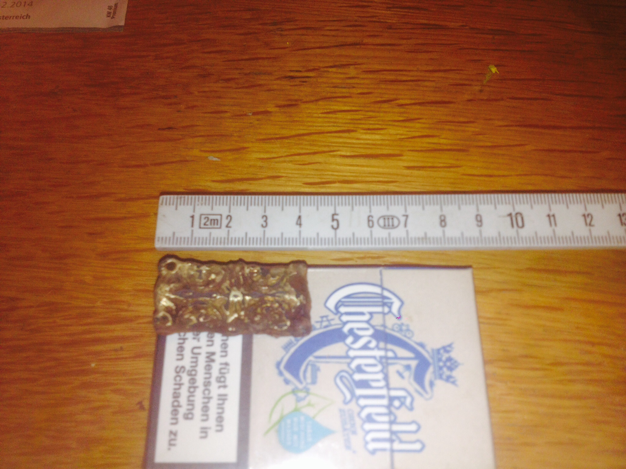 Scheint mit Gold überzogen zu sein. In den vier Ecken sind Löcher wobei in einem Loch eine Niete sitzt.