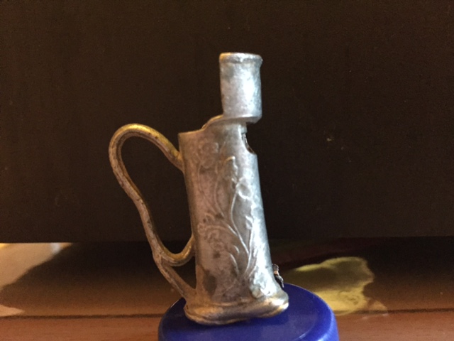 ich glaube, dass die Pfeife mal mittels Band am Hals hing, und der obere Teil des Henkels rund war, dass sie auch am Finger getragen werden konnte..