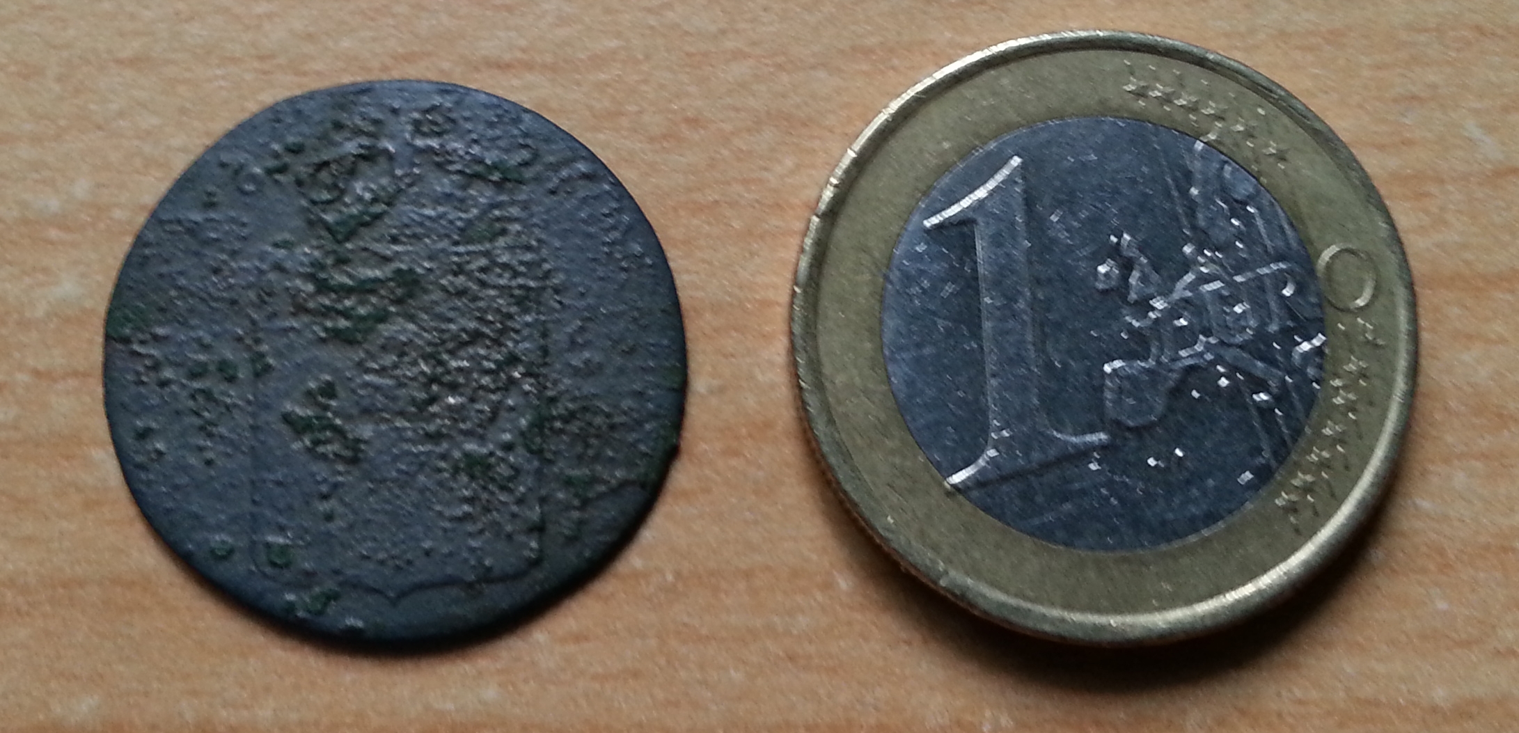 Auf der Rückseite ist ein Wappen mit Krone darüber erkennbar.