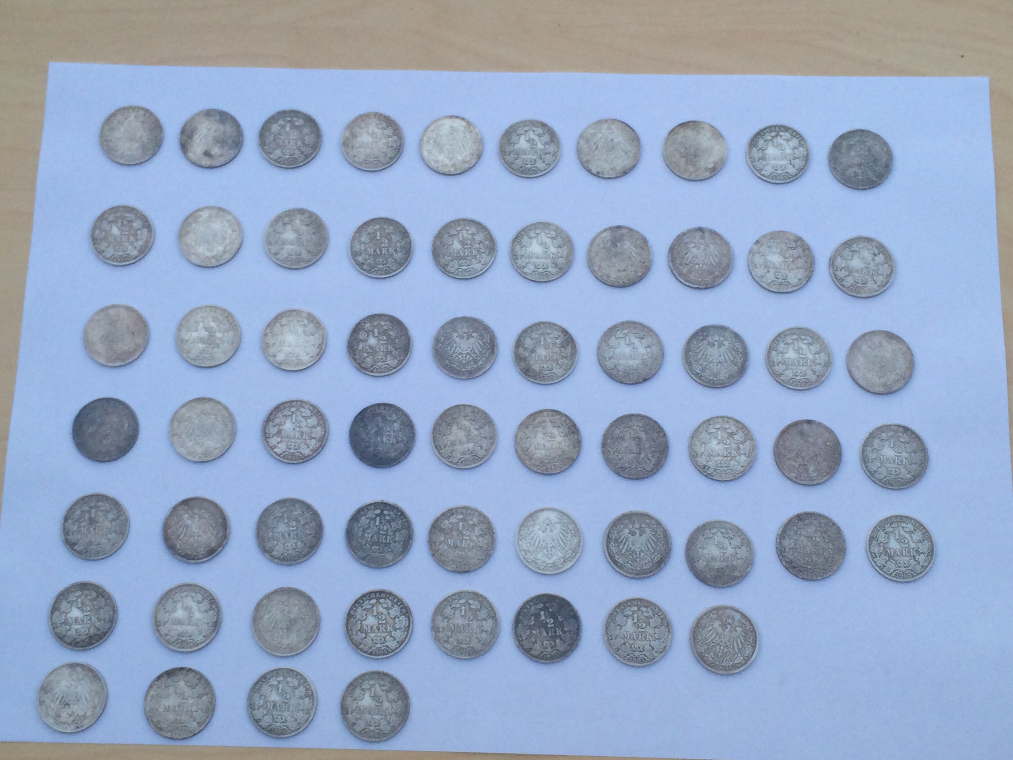 Habe am Wochenende diesen Silbermünz Hort gefunden. Insgesamt 62 stück. Sind alles die selben, bis auf das Prägejahr.