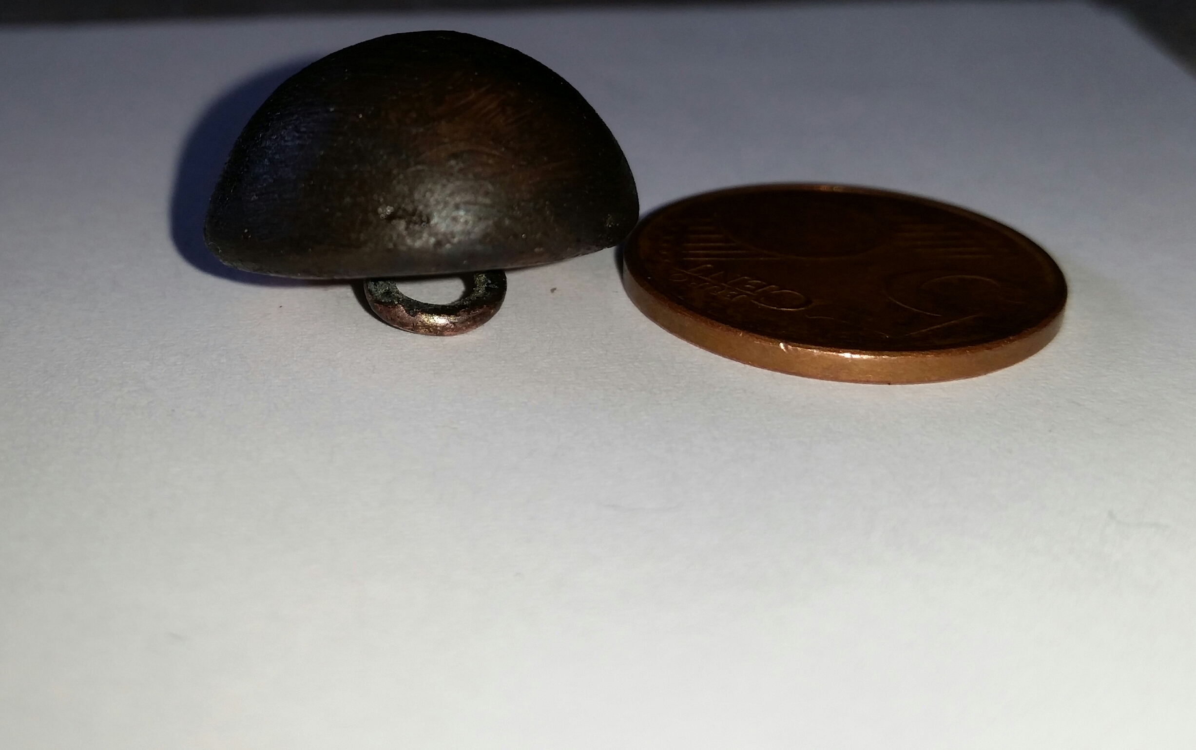 hab neulich diesen Halbkugelknopf/Uniformknopf gefunden und hätte gerne gewusst wie alt er ist. Mit der Bezeichnung auf der Rückseite habe ich im Netz nichts gefunden. Das Unterteil ist aus Messing das Oberteil ist aus Eisen.