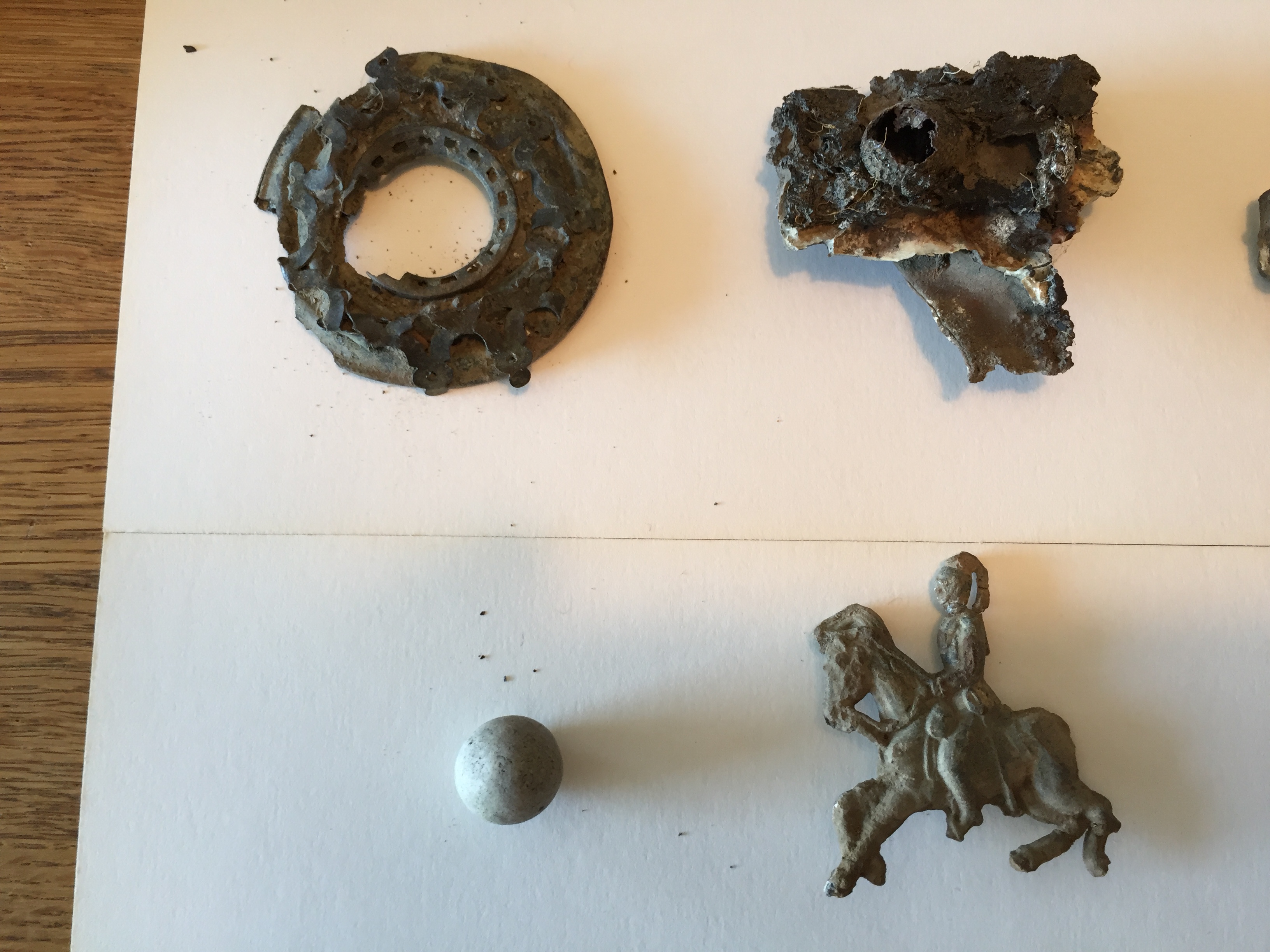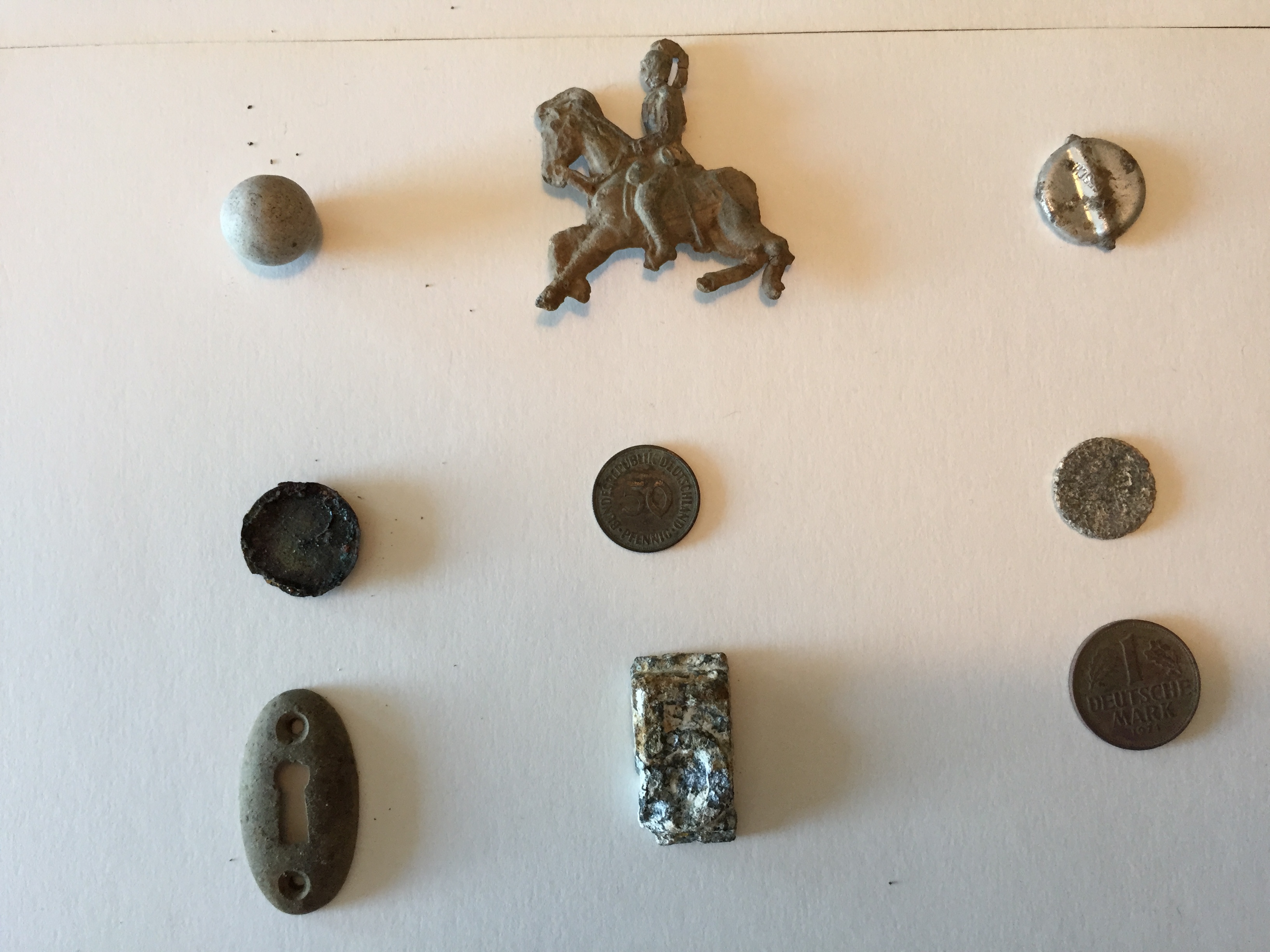 Neben den ganzen Sachen habe ich immer wieder geschmolzenes Metall gefunden, eins von den Dingern hab ich auch auf den Fotos, das liegt echt zu Hauf unter der Erde.