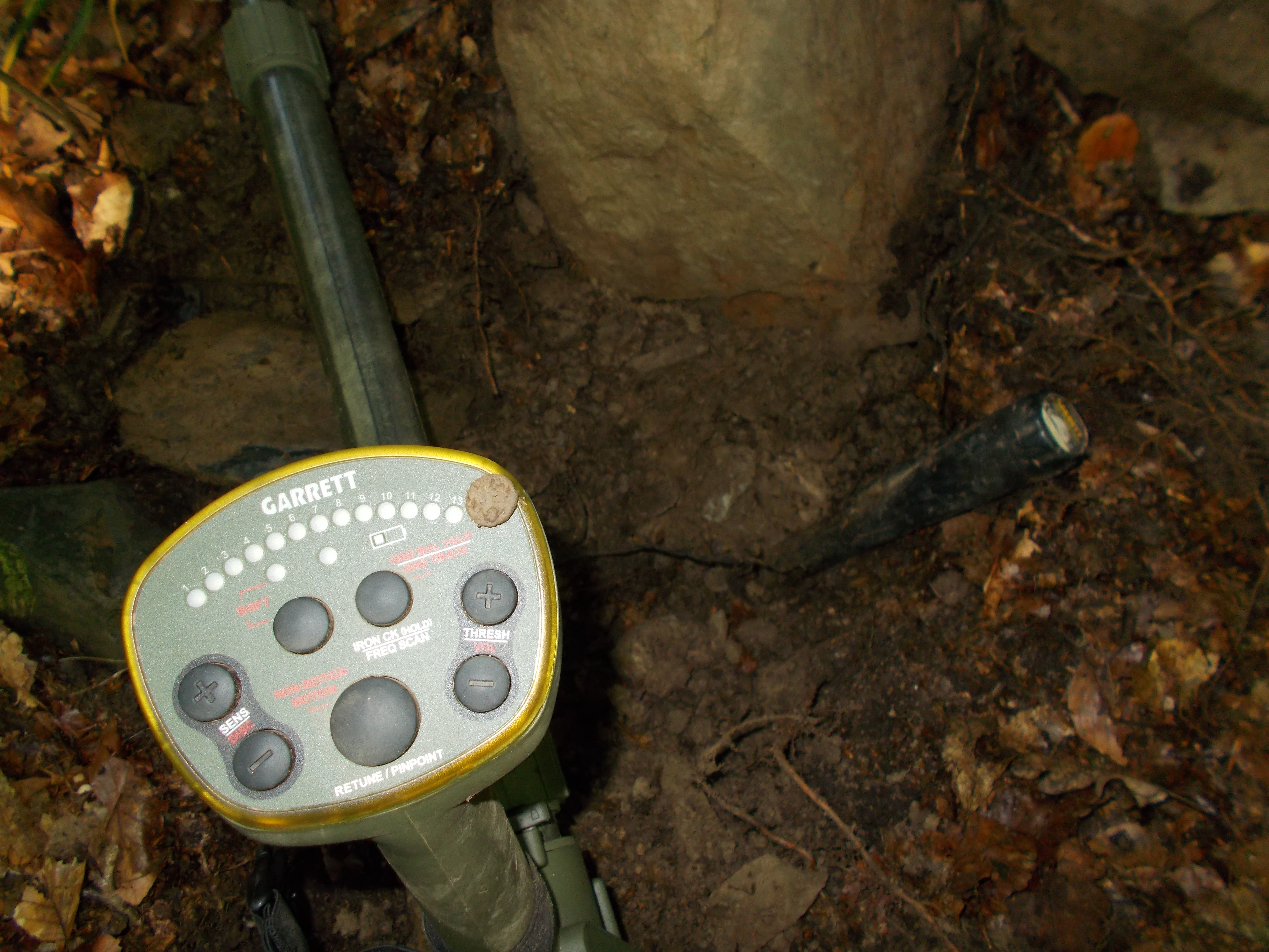 Etwas später habe ich mit dem Thershold in der Werkseinstellung (7) auf ein recht leises und nur mit 1-2 LED beim schnellen Anschwenken aus verschiedenen Richtungen angezeigtes Signal gegraben. Bei etwa 28-30 cm hatte ich dann mit dem Pinpointer den oberen Rand einer fast hochkant im Grabungsbereich stehenden Münze geortet.