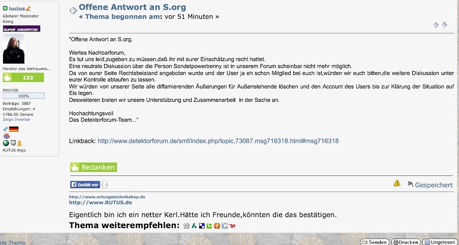 Wallenstein hat geschrieben:Dieser sollte auch die Kommunikation unter Kontrolle halten. Sei es was in den Foren läuft, sei es was die Presse schreibt oder was die Archäologen schreiben. Diese Schmutzkampagne in der Presse war nur möglich, weil die Archäologen der Meinung sind, dass sich Benny eh nicht wehrt. Hier schlägt der Staat auf einen seiner jungen Bürger ein, den er eigentlich an die Hand nehmen sollte. Das muss sich ändern. Benny: Der Anwalt soll schauen welches Kapital sich aus den öffentlichen Vorverurteilungen der Presse holen lässt. Auch soll er prüfen ob Du Anteile am Fund geltend machen kannst, damit Du finanziell mit einem blauen Auge aus der Sache herauskommst. Diese ganze Schmutzkampagne sollte wohl auch der Einschüchterung dienen damit Du keine Forderungen stellst. Ggf. kannst Du einen Deal/Vergleich mit dem Amt heraushandeln. Aber das soll der Anwalt in die Hand nehmen.