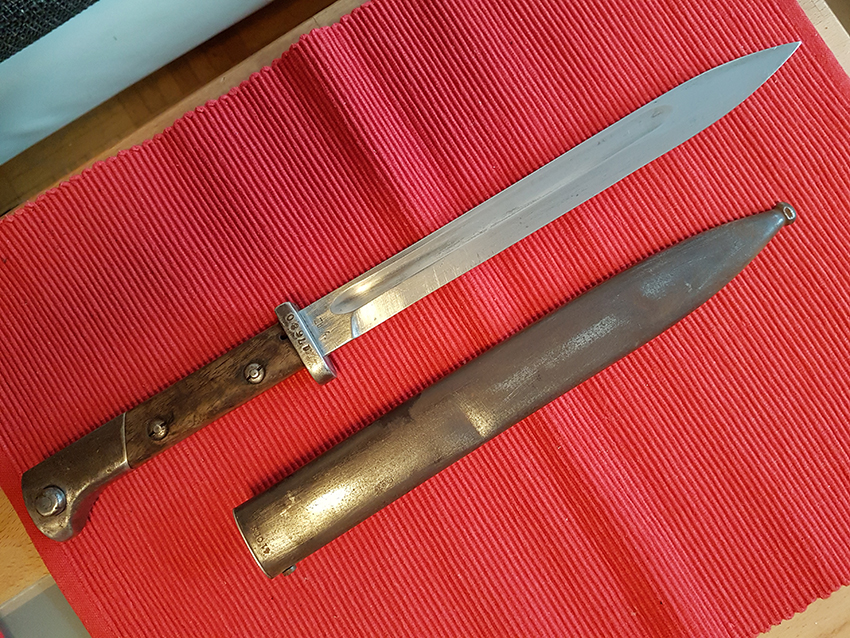 Beim Ausräumen des alten Dachbodens (meiner Schwieger-großeltern) ist hinter einem Holzbalken ein sehr rostiges Bajonett hervorgekugelt, und ich bin nach ein bisschen Reinigung (ich will nix kaputtmachen) auf Nummern gestoßen, hab aber überhaupt keine Ahnung wie man die zuordnet, auch kurze Recherche im Netz hat mich nicht weitergebracht. Aber mich würde die Geschichte dieses Fundstücks schon irgendwie interessieren. Es könnte auch aus WW1 sein, wie gesagt, ich hab keine Ahnung. Hier Bilder von vorn und Hinten auf Höhe Parierstange/Ricasso, sonst sind nirgends Stempel oder Nummern zu erkennen. Gefunden wurde das in Bruck an der Mur, Österreich. ich vermute Bajonett und Scheide gehören eigentlich gar nicht zusammen, da keine der Nummern übereinstimmen. Ich würde mich sehr über eine Tipp freuen, wie ich da mehr drüber rauskriege, bzw mir da jemand was dazu erzählen kann.