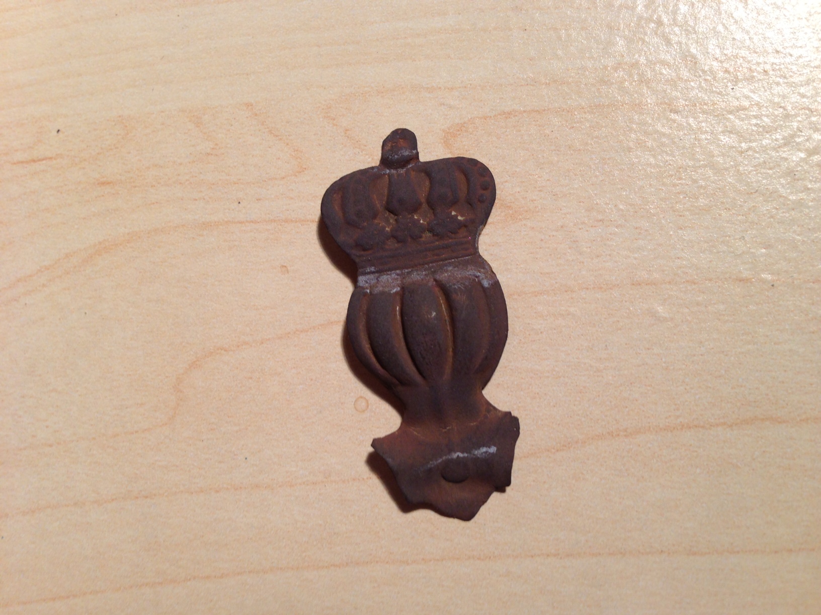 ein Anstecker? Es ist 4 cm hoch und 2 cm an der breitesten Stelle und war in der Mitte umgebogen beim Zeitpunkt des Fundes …