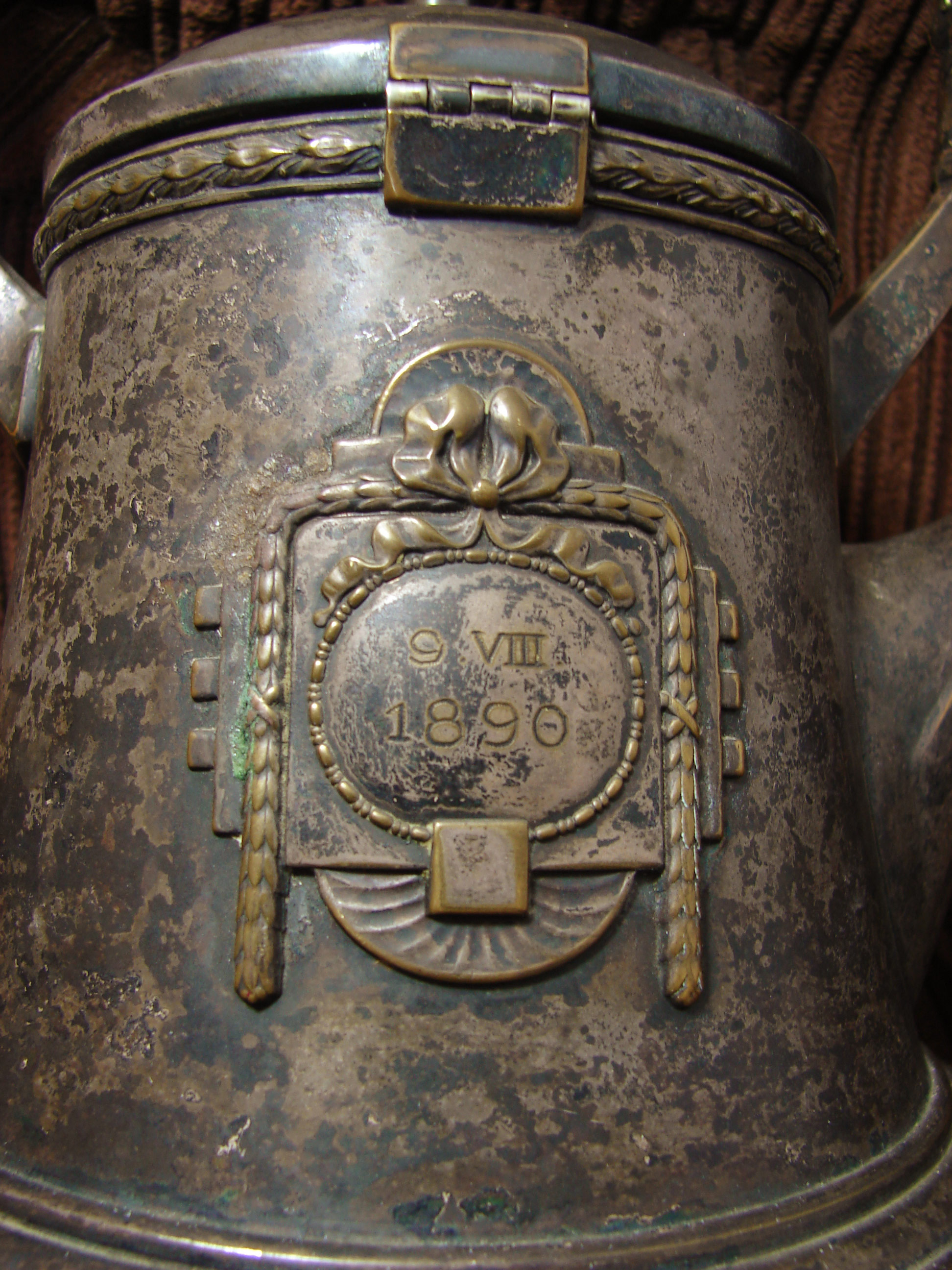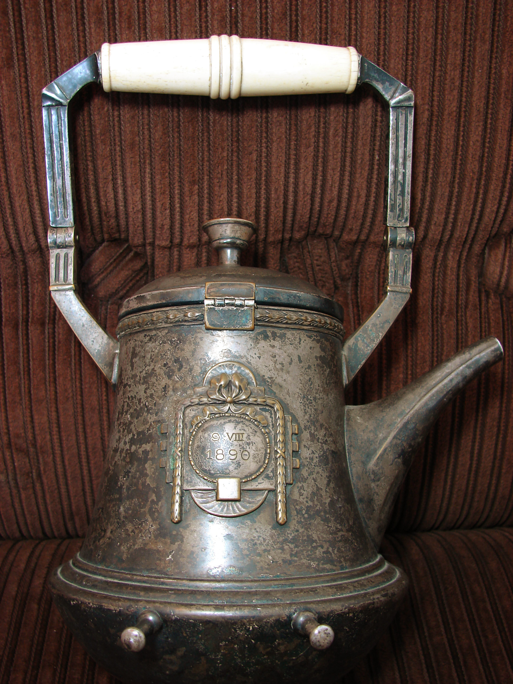 Es handelt sich um eine (anscheinend) versilberte Kanne mit Griff aus Elfenbein oder Horn (?) und der Aufschrift