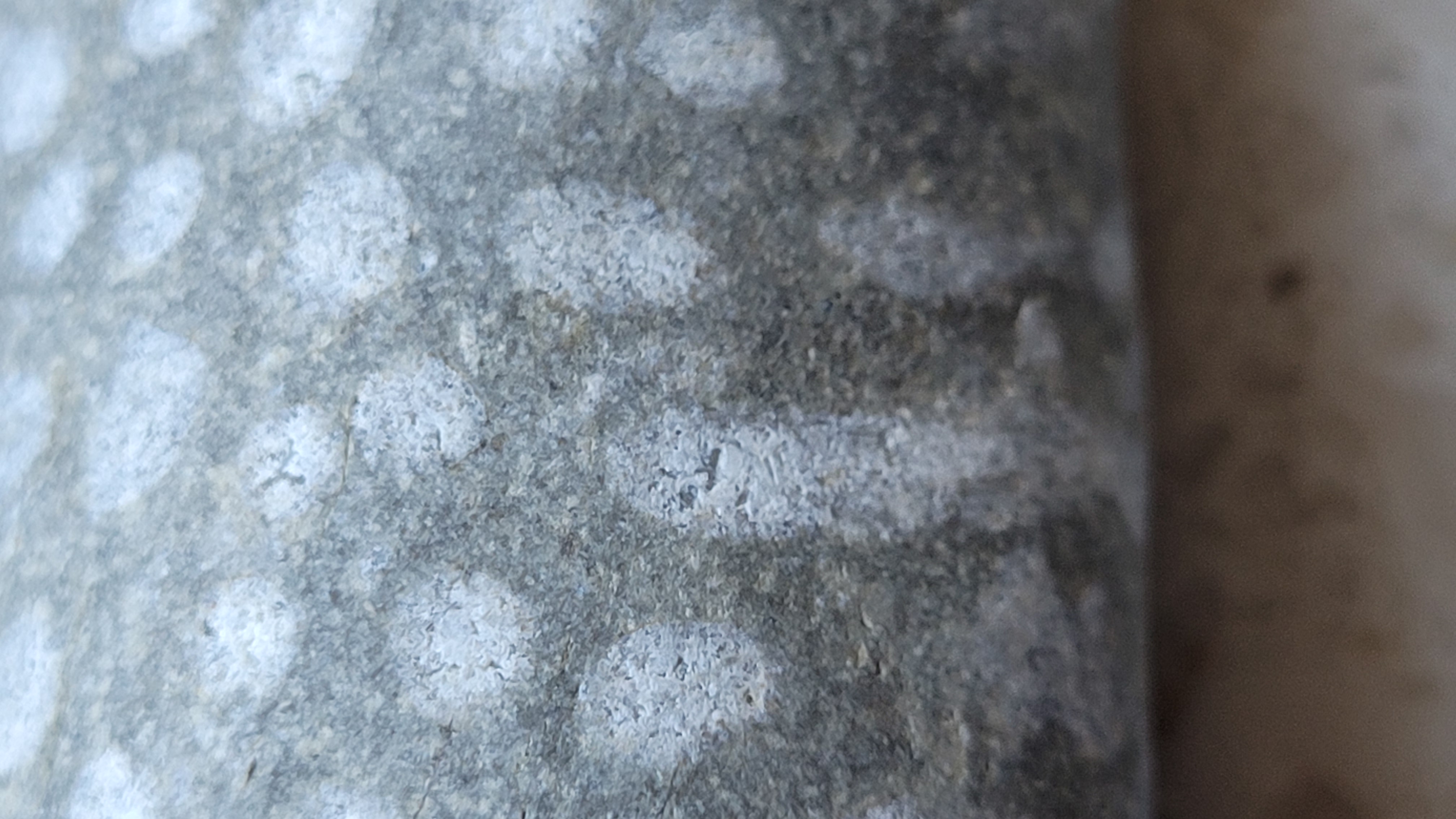 Er hat runde, weiße, eingelagert Kanäle. Diese gehen ganz durch und sind parallel. Das letzte Bild zeigt die Seite. Da erkennt man die durchgehenden Kanäle.