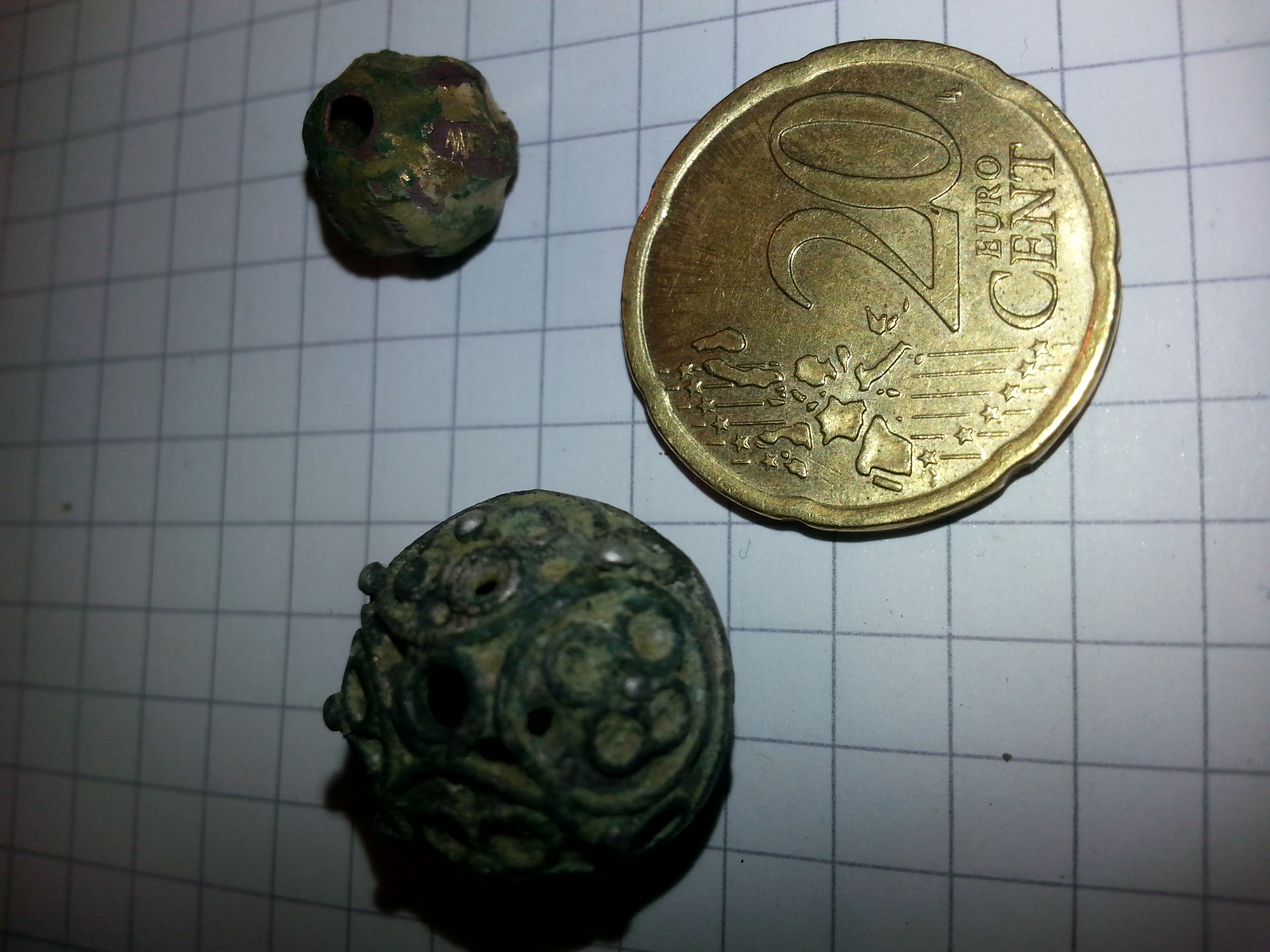 heute waren auch diese beiden Kugeln/Perlen dabei. Sie sind sehr leicht. Beide innen hohl und haben ein Loch auf beiden Seiten. Die größere schimmert Silber mit grüner Patina und hat relativ gradlinige Löcher. Die kleinere hat verschiedene Farben und schimmert golden. Sie hatte versetzte Löcher.