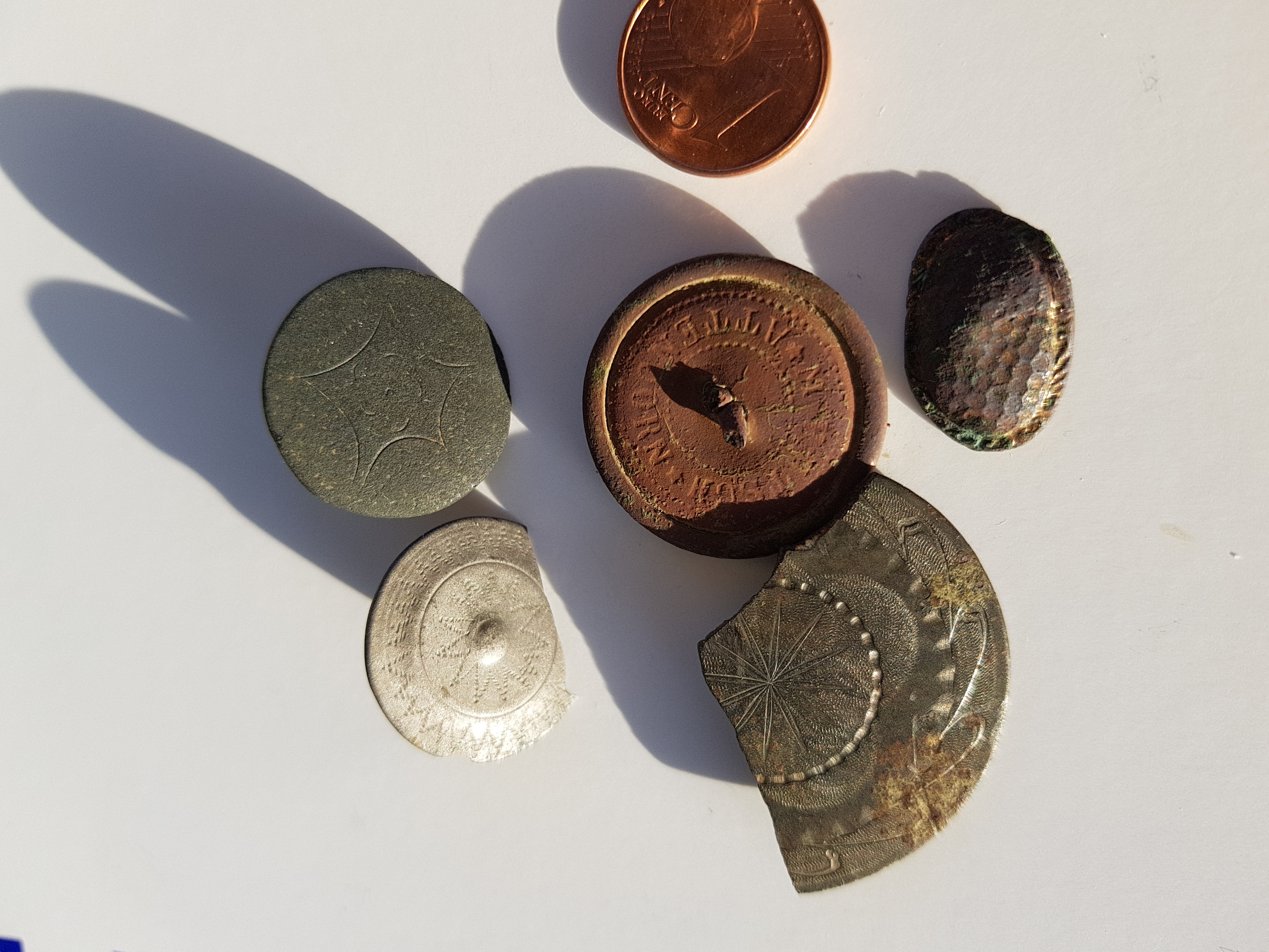 Hi, der Löwe dürfte zu nem trachtengedöns bzw. Handwerkergedöns gehören. Des Krönchen könnt ein messerkrönchen sein, muss nicht zwingend zu dem fund gehören, außer du hasst es kaputt gemacht :D . Die Knöpfe dürften aus dem 18 Jhdt. sein.