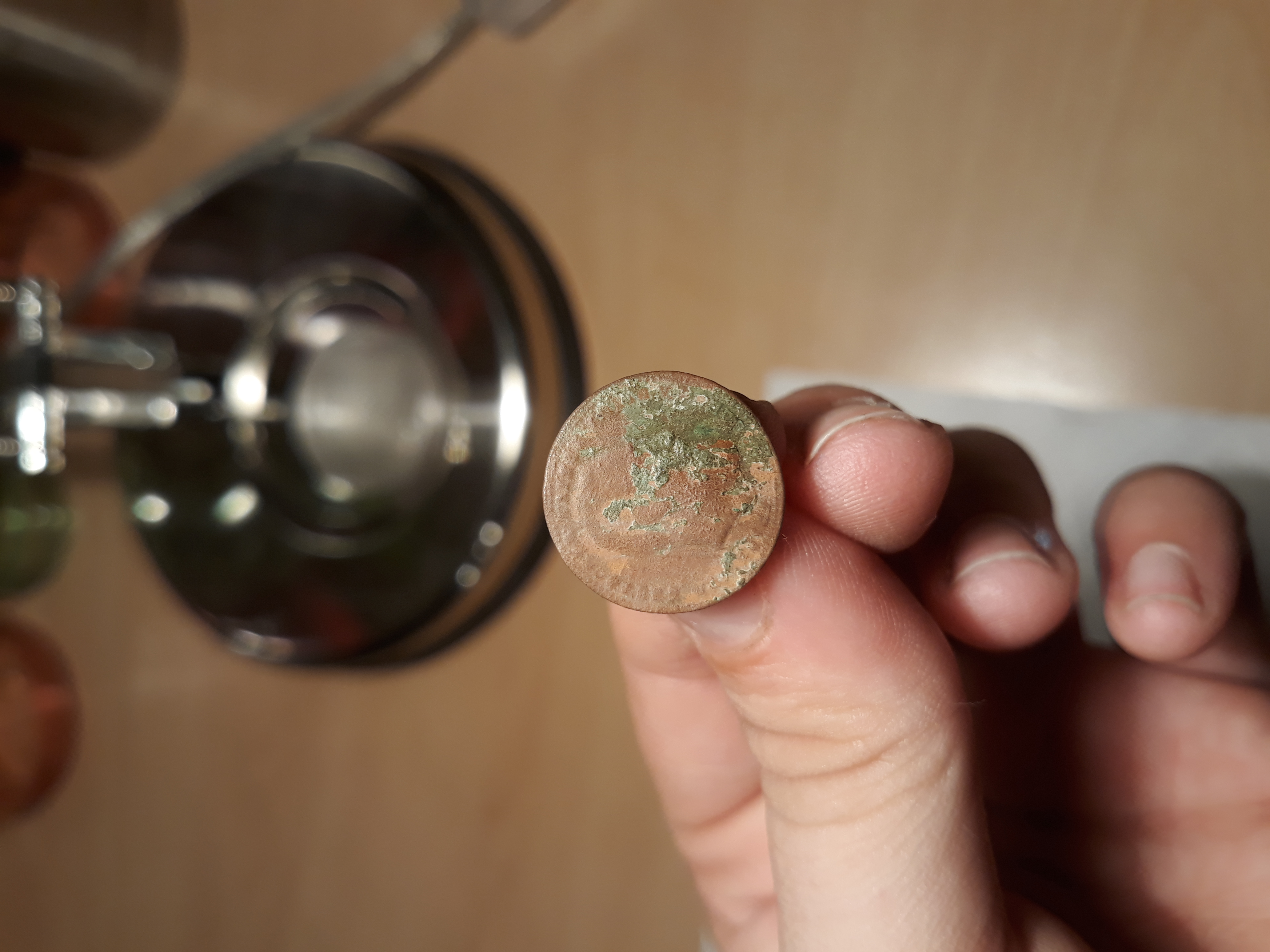 vielleicht weiß hier jemand was dazu? Material Kupfer, Öse angelötet. Vorderseite: Männerkopf, denke mit Umschrift. Zu klein um sie lesen zu können. Rückseite: ich kann nur "zu lagen"..erkennen und eine Unterschrift darunter.