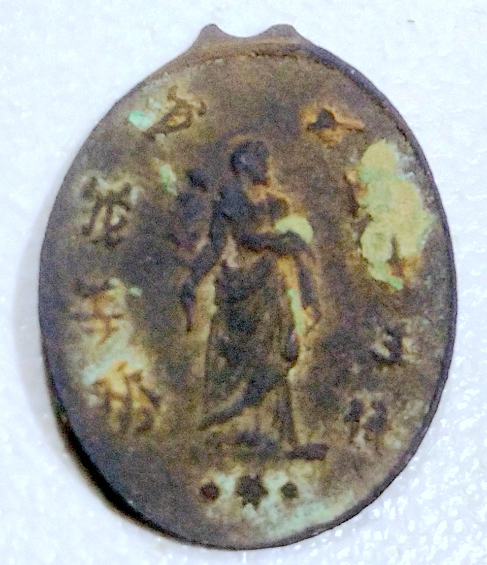 Es ist wohl ein Heiligenanhänger, ziemlich philigran, ein Mann mit Gewand ist abgebildet und vermutlich hebräische Buchstaben.