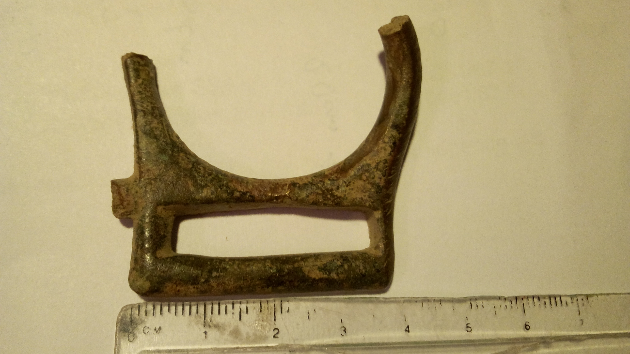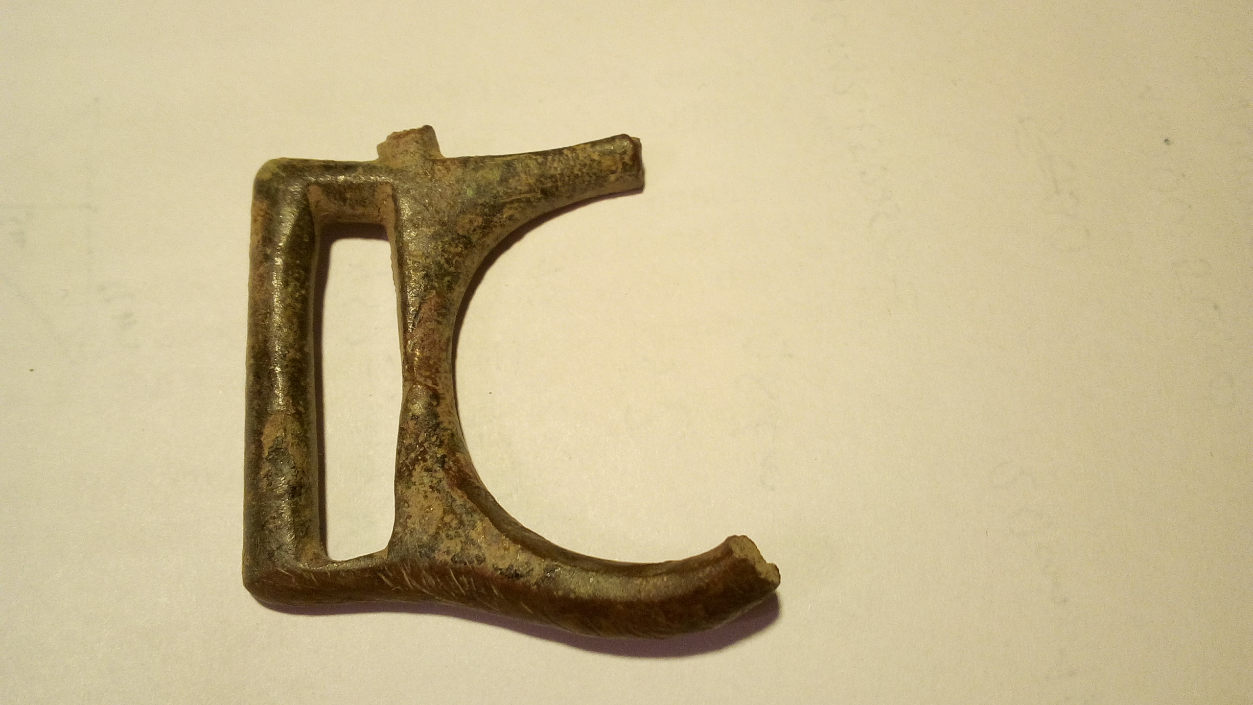 Hi hab dieses Schnallenteil in meiner Fundkiste gefunden. Es besteht aus Messing und ist an 3 Stellen abgebrochen.