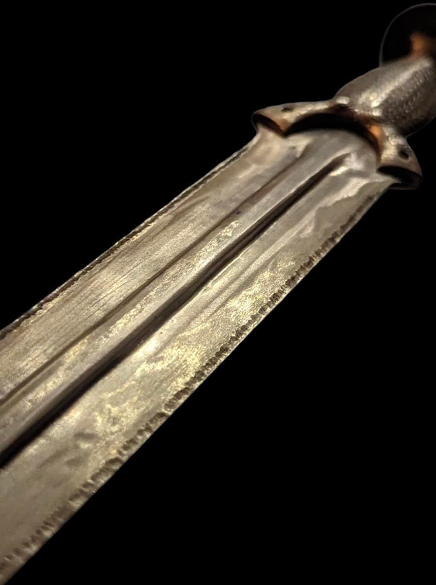 - Dieser Dolchtyp zeichnet sich durch seine flache, triangulär geformte Klinge und das einzigartige Heftdesign aus.