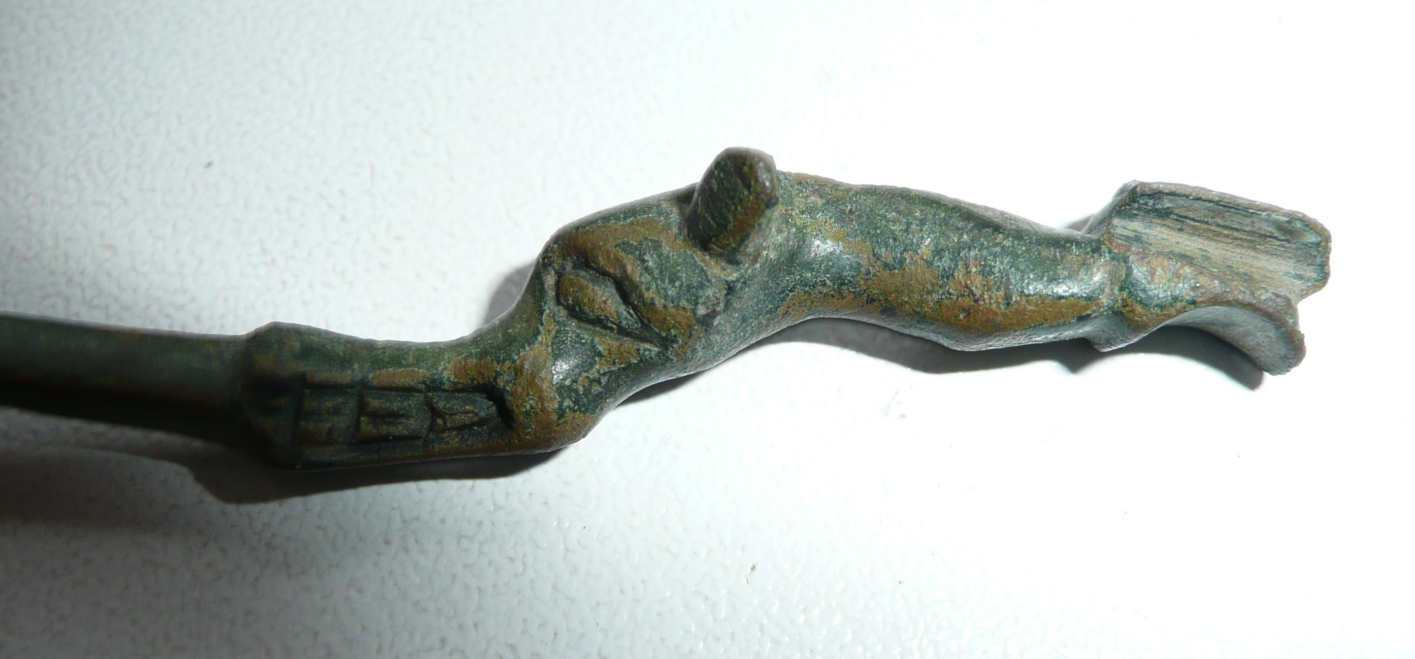auch der Abstand vom Kopf zum gezackten Ende ist zu kurz. Das Ende ist trapezförmig gearbeitet und hat auch noch den kleinen halbrunden Aufsatz (Eingriff) der ideal geeignet wäre, um dort einen Finger anzusetzen.