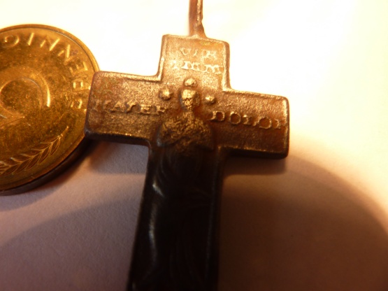 Oberhalb des Kreuzes erkenne ich wie gesagt VI also 6, was auch auf die sechste der "Sieben Schmerzen"hindeuten könnte, aber um das zu deuten bin ich von der Materie zu weit weg, vielleicht kann jemand anderes weiter helfen...