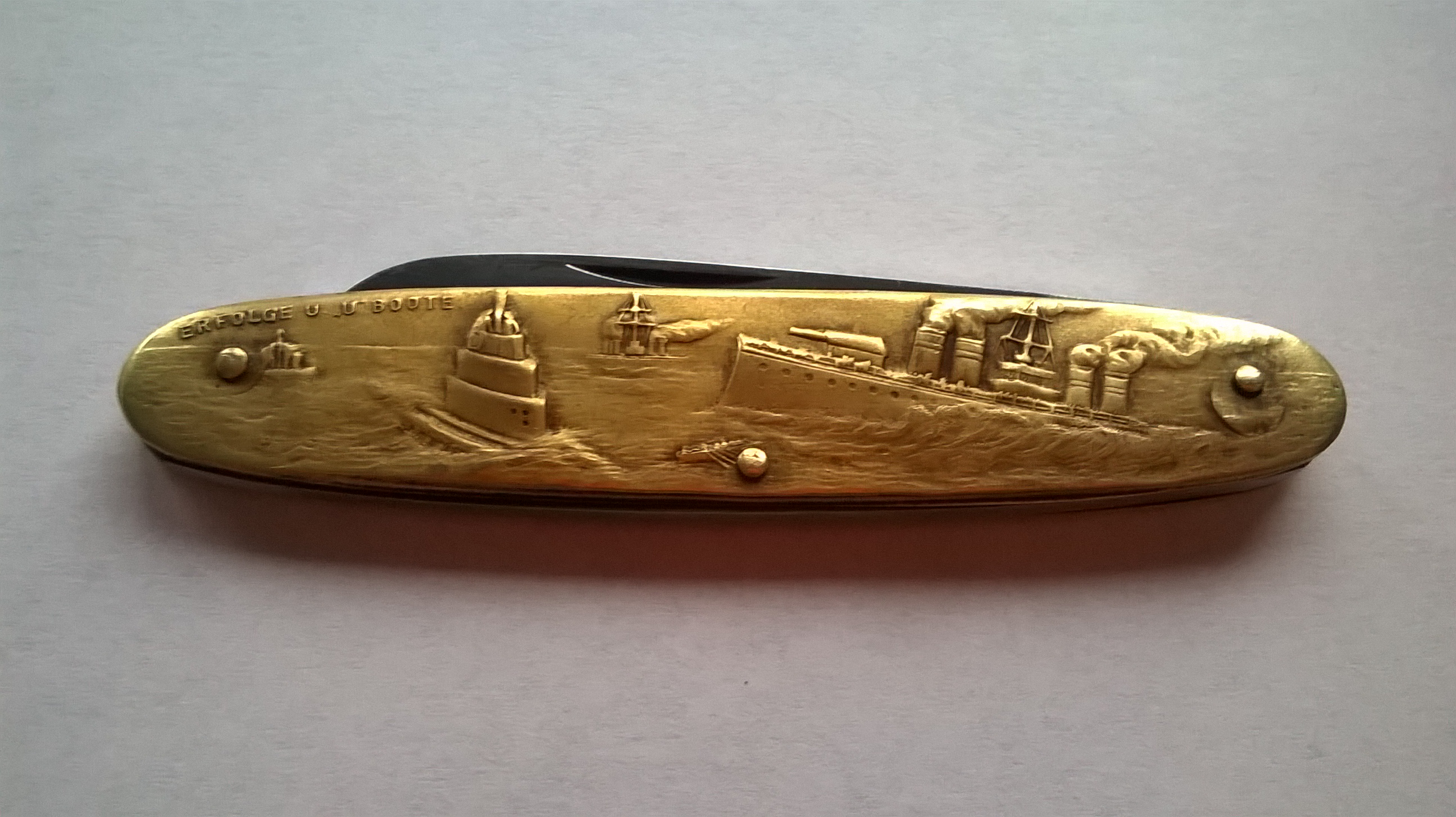 Meine Frage dazu wäre, ob jemand etwas darüber weiß.Ist es ein original? Der Mann dem es gehörte wäre nun um die 80!Nur finde ich die Schrift auf der Klinge für das Alter zu gut.Der Hersteller des Messers ist Solingen.Und auf der einen Seite des Messers sind ein sinkendes Schiff und ein Uboot, darüber der Text"Erfolg unter U- Booten" zu sehn.
