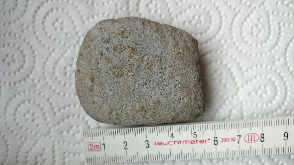 Jetzt hat sie auf dem gleichen Acker ein Steinartefakt entdeckt.Es sieht aus als wurde es von Menschenhand bearbeitet. Es liegt gut in der Hand um irgendwas zu zermahlen. Scharf ist der Stein nicht.Es scheint relativ weiches Material zu sein. Vielleicht ne Art Sandstein. Er glitzert auch leicht.Eine Seite ist flach am Stein ,wo man gut den Zeigefinger drauflegen kann. Das komische ist das der Stein nach Estrich bzw. Putz riecht.